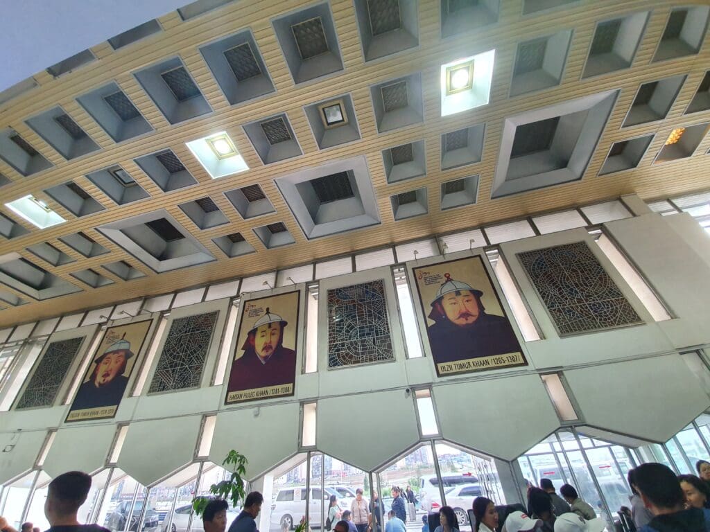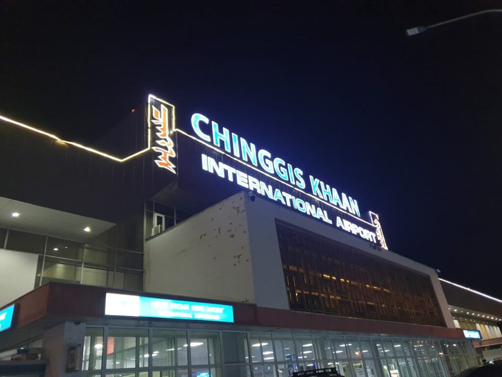 Following my day-long stay, I headed out of my room at handed over my key to the Tulip Hotel’s reception staff before heading outside and into the dark and drizzly night. Fortunately, the driver was already waiting outside the hotel and he escorted me to the unmarked Honda Prius that would transport me the 20 or so kilometres to the airport. Continuing with the Japanese theme, the car’s steering wheel was on the right hand side whilst all information on the centre console was in Japanese. This reminded me of the multiple second hand cars imported from Japan I had ridden during my time in Georgia. After leaving the hotel, the car sped down the mostly unlit and occasionally severely bumpy roads of Mongolia’s capital city. Following a speedy ride down the city’s backstreets, reassuring me that we were not heading out into the countryside, the taxi eventually rejoined the main road that leads to the airport. A few minutes later, the car descended the hill that leads to the airport and drove past the large lit up portrait of airport namesake and national hero Chinggis Khan before pulling up to the departures level of the terminal. As the hotel reception worker had claimed, the driver only demanded a standard 30,000 tugrik and after handing this over I headed straight into the main terminal.