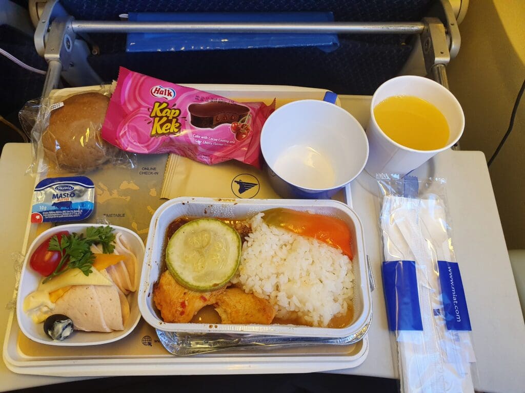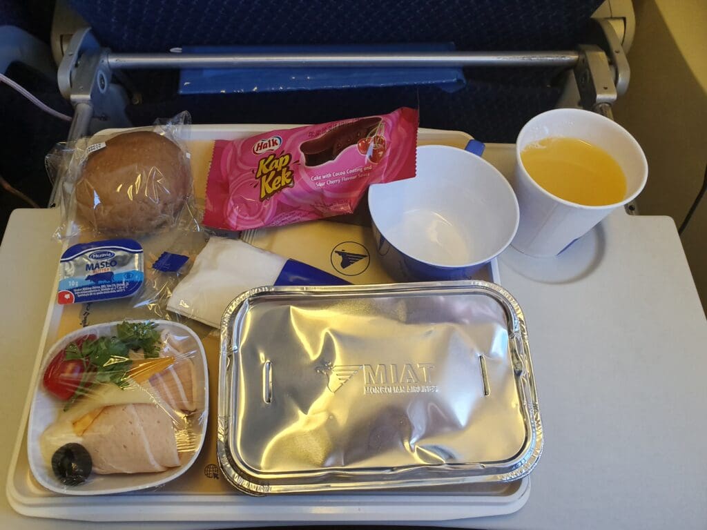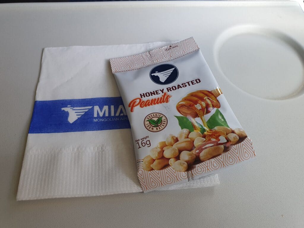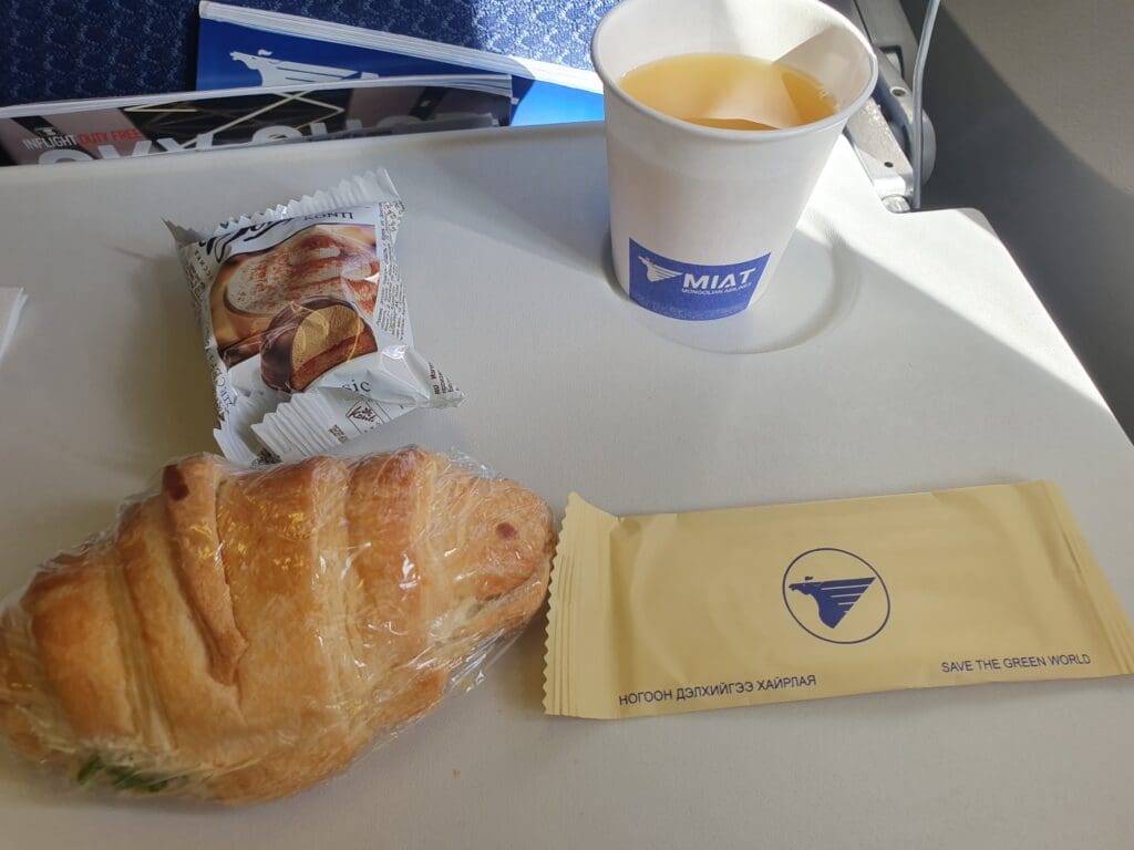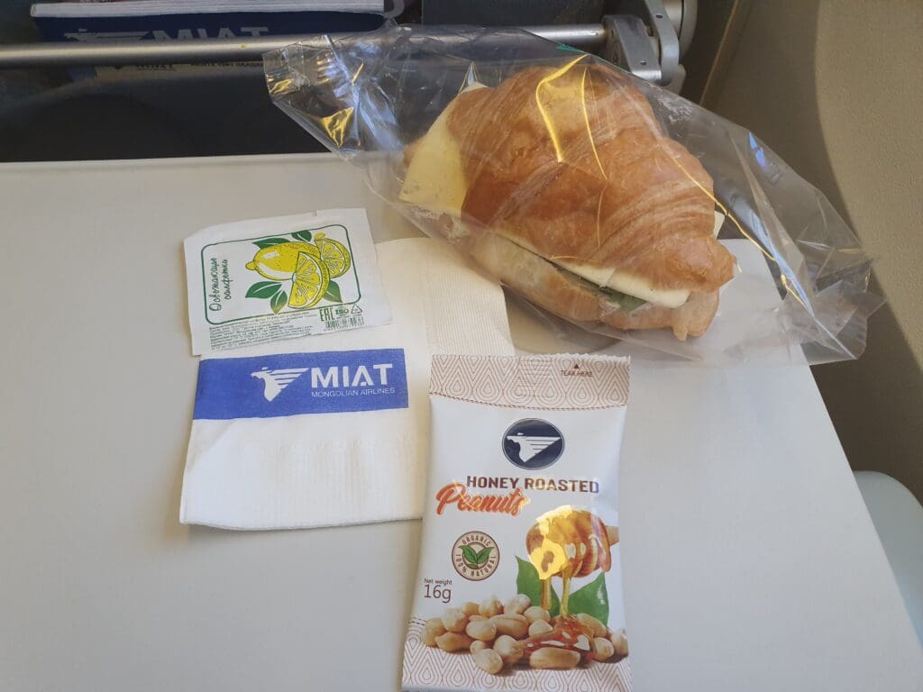 Fortunately, I coincidentally managed to wake up just as the flight’s light brunch service commenced at 1000 Berlin time. Sitting at the front of the cabin I ended up being one of the first passengers to be served. This time, I was handed another filled croissant (albeit containing a different filling of meat, cheese and gherkins), a packet of MIAT’s honey-roasted peanuts in addition to a serviette and a lemon-scented wet wipe. This was then followed by a round of drinks, and, being rather thirsty I requested both a coffee and an orange juice from the friendly flight attendant. As with my flight from Busan, hot beverages were served in a DIY style with passengers handed a cup of hot water along with a coffee sachet or a teabag. All in all, I was fairly satisfied with this service. Granted, it may not have been as plentiful as the offerings of many other East Asian airlines on their short-haul services, however, it certainly beat the offerings of many European carriers with similar flight times.