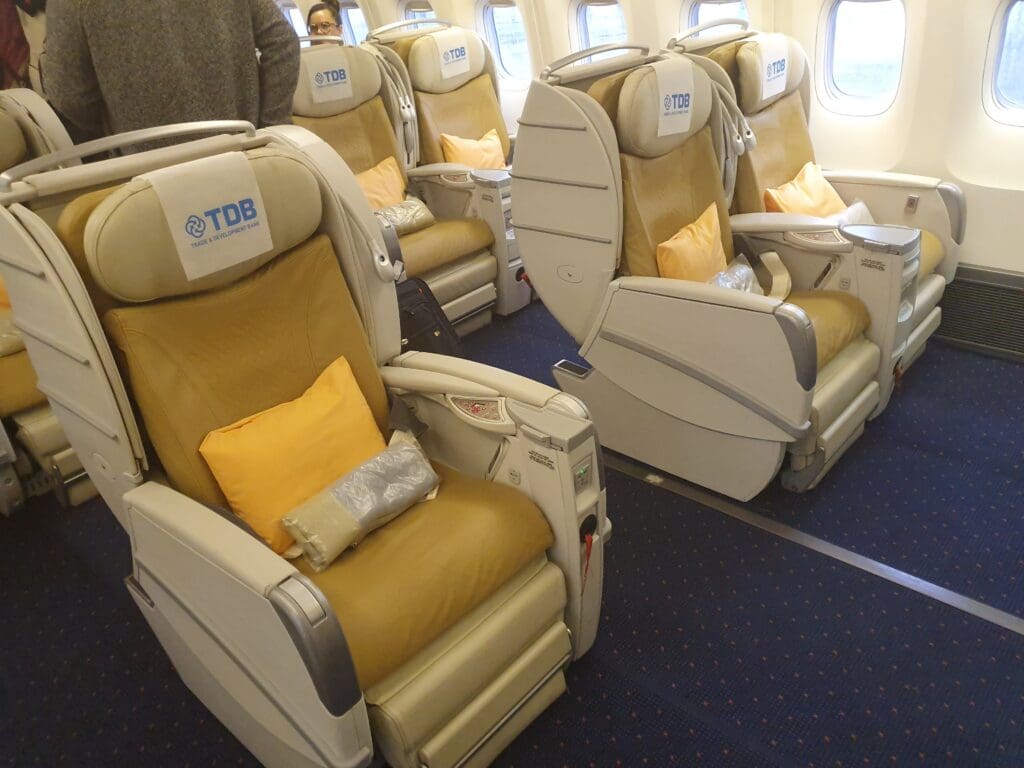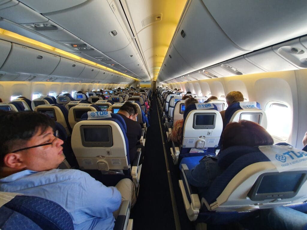 Immediately after leaving the forward galley, I found myself in the aircraft’s 25 seat Business cabin. This consisted of slightly dated and privacy-lacking shell seats in a rare 2-1-2 configuration. There, each seat was covered in a beige pleather cover and came with USB-A ports, a universal plug socket and a reasonably large inflight entertainment screen. Continuing onwards, I then entered the aircraft’s forward Economy cabin. Curiously, whilst the seats in this smaller forward cabin are the model as those in the rear cabin and arranged in the same 2-3-2 layout, these are covered by a beige fabric cover sporting a tradition inspired repeating pattern, whilst those in the rear Economy cabin are covered by a much duller blue fabric featuring the same pattern as on those seats on the Boeing 737 that I had sampled several days earlier. As with the Boeing 737, all seats in both classes featured a disposable antimacassar that advertising Mongolia’s Trade and Development Bank.