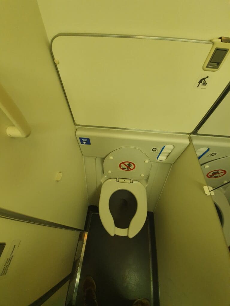 Fortunately, as the aircraft headed into Polish airspace, the clouds began to clear up a little revealing the green summer scenery 36,000 feet below the aircraft, although seeing as I spent much of the flight drifting in and out of sleep, I can’t comment too much on this. Around an hour and fifty minutes after taking off from Moscow with around 140 miles or 225 kilometres to go until Berlin, the aircraft could be felt gently commencing its descent over Poland’s Greater Poland region. As had been the case before the aircraft arrived in Moscow several hours previously, this was almost instantly followed by an automated announcement with the usual instructions regarding seatbacks, tray tables, window shades and seatbelts. Seeing as I would likely not get the opportunity to do so again, I decided to make one final trip to one of the aircraft’s lavatory. As had been the case prior to the aircraft’s arrival into Moscow, I found this to be in a clean and pleasantly acceptable state despite being at the end of the aircraft’s long journey over from Mongolia.