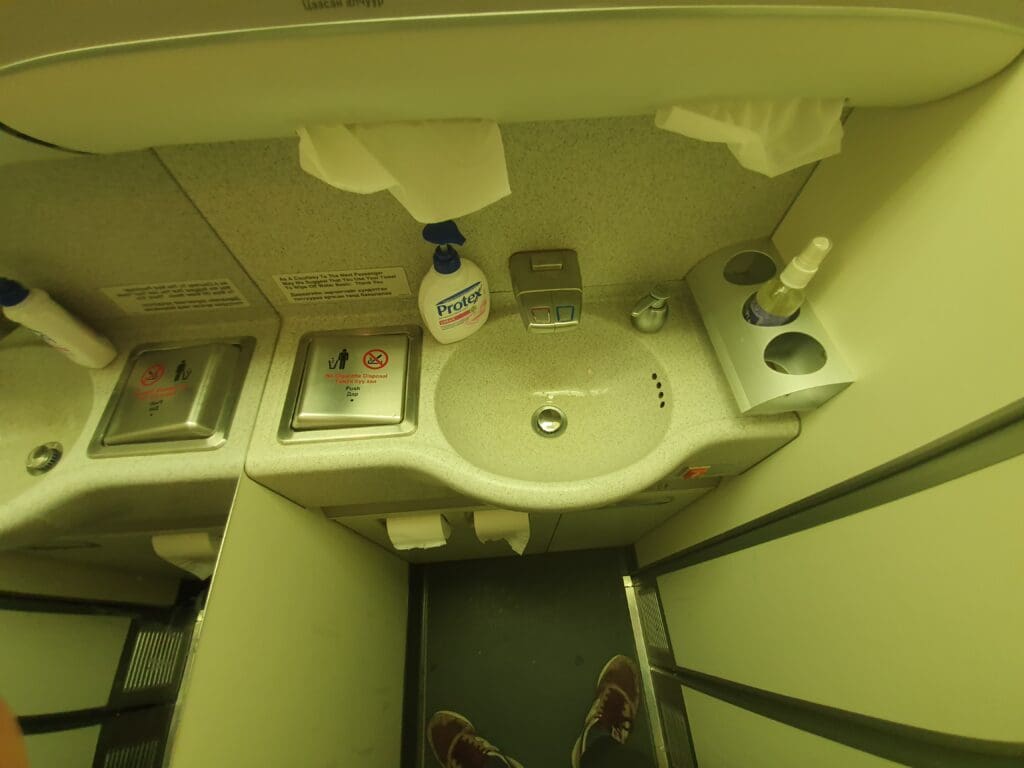 As the flight entered its final quarter, like many passengers at this time I decided to visit the lavatory. After passing to the south of Nizhny Novgorod, I headed out of my seat and joined the queue for one of the three toilets at the rear of the aircraft. Following a long wait, I opened the door to one of these which I found to be pleasantly clean, tidy and sufficiently stocked with the basics.