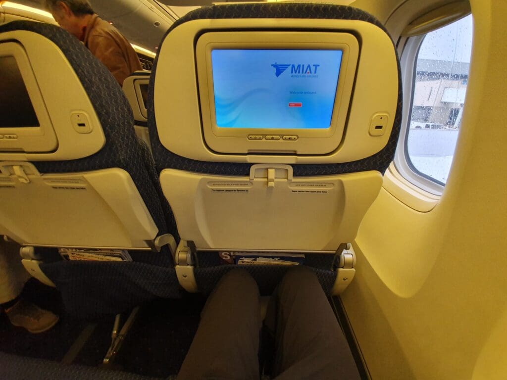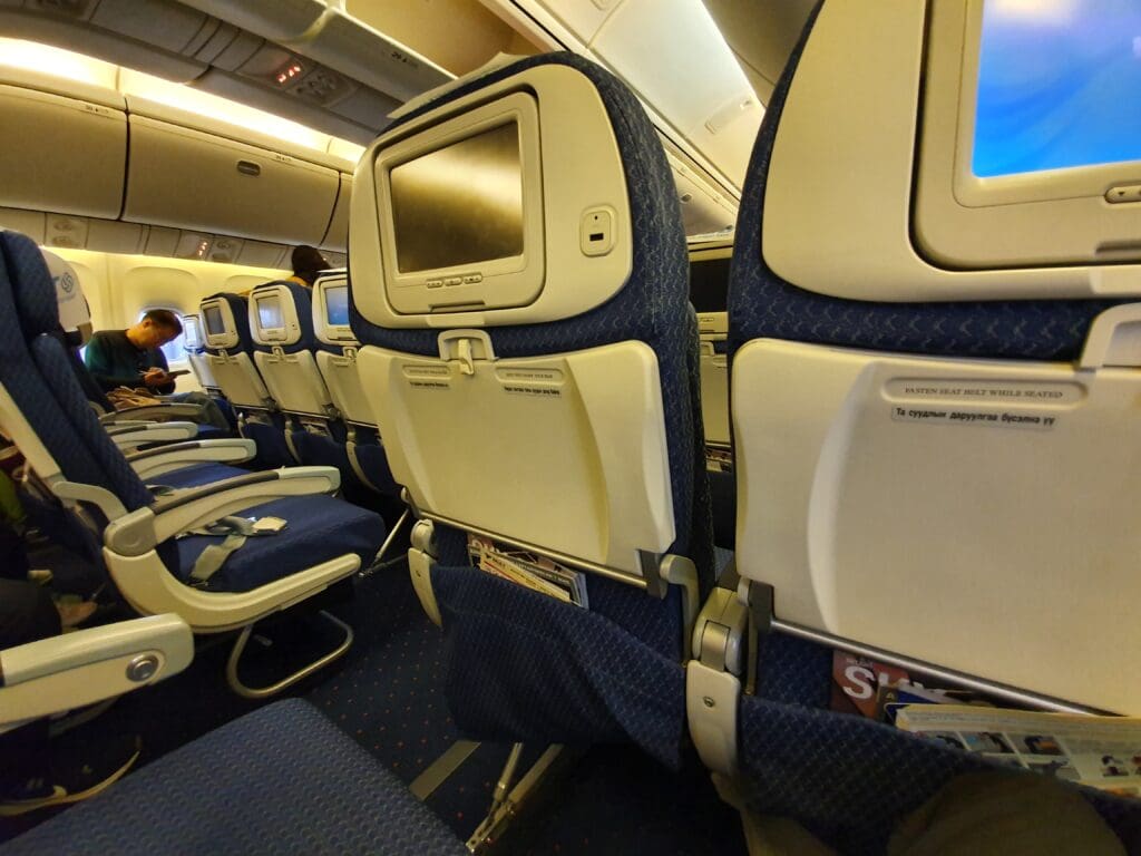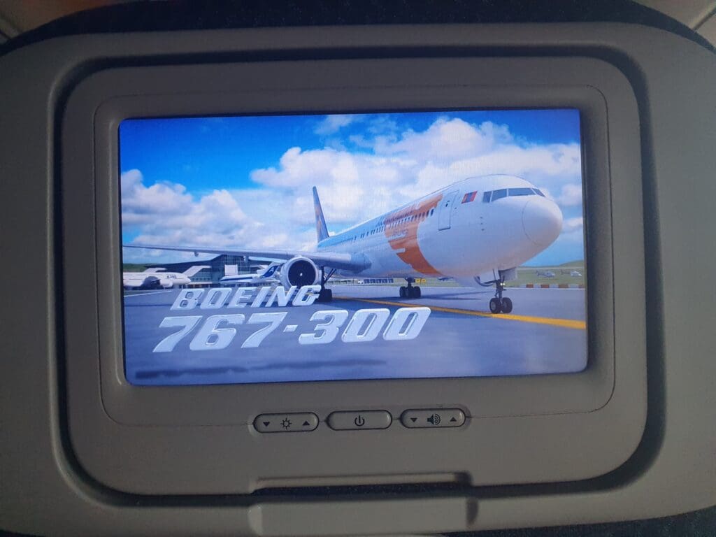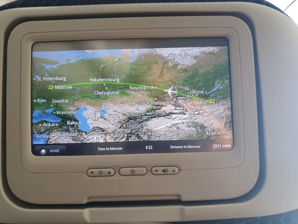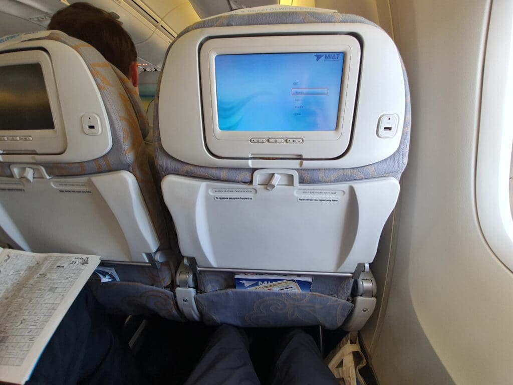 During the aircraft’s time on the ground, this appeared to have been cleaned to a decent standard and I failed to spot any remnants from previous passengers. However, I did notice a host of marks and scratches in the area around my seat, despite the reasonably young age of the jet. However, my greatest problem came in the fact that the aircraft seemed to be rather lacking when it came to legroom – something that seemed to be well below average for a widebody aircraft operated by a full service carrier. Turning to the seatback pocket, aside from the vital safety card and sick bag, this contained a Sky Shop catalogue, a copy of the airline’s self-titled inflight magazine and the Mongolian edition of Forbes magazine. Despite being a reasonably long flight over to Moscow and the chilly temperatures inside the cabin, no pillows or blankets had been placed on the seats before departure. That said, the crew seemed to be willing to distribute these to those who requested them later on during the flight.