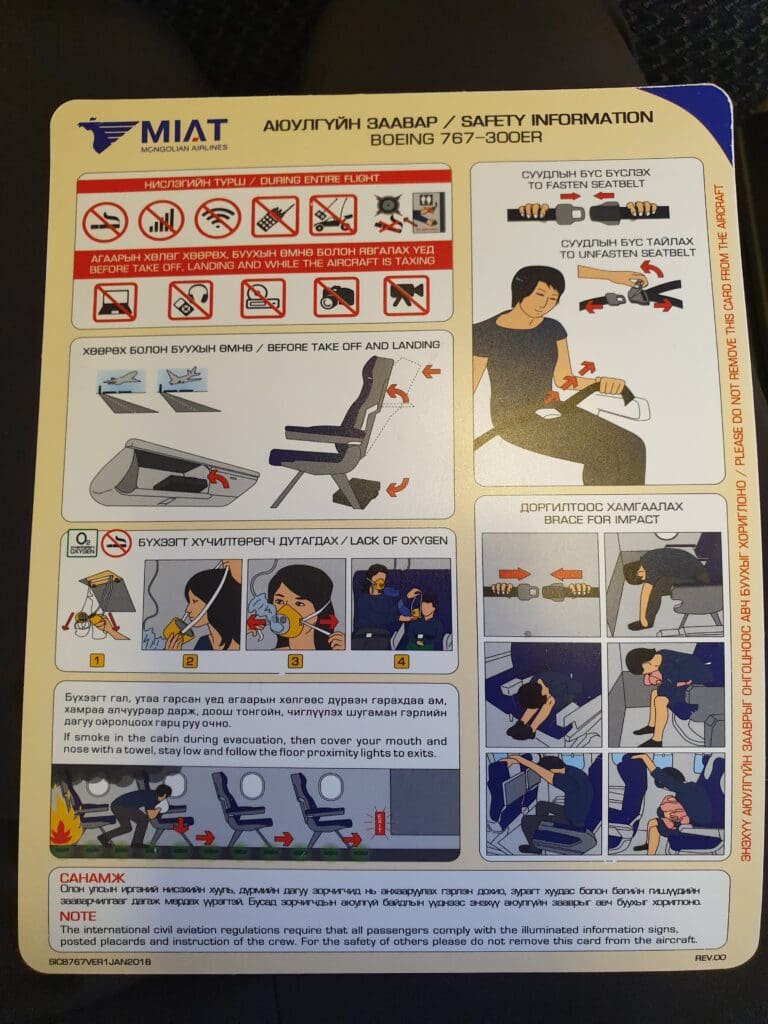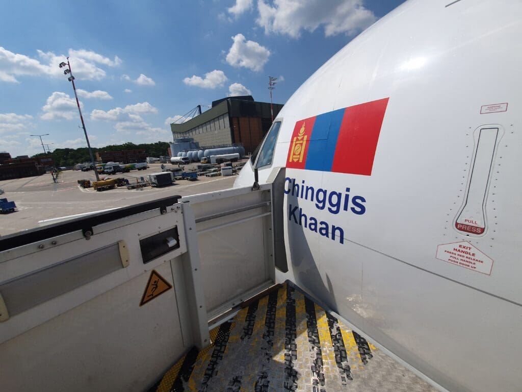 A little after 0530, the newer of MIAT’s two Boeing 767-300ERs, the locally registered JU-1021, came into a halt at Stand 2 after its early morning service from Korea. Assembled at Boeing’s Everett plant and carrying the line number 1050, this aircraft first took to the skies in March 2013. This makes it the seventh youngest passenger Boeing 767 in the world, with this being a little over six years old at the time of my flight. Following testing, in May 2013 the aircraft was ferried over to Mongolia to commence its career with the country’s national carrier, proudly sporting the name Chinggis Khaan after arguably Mongolia’s most known figure. Since then, the aircraft has been sent to destinations across MIAT’s route network, and features a grand total of 252 seats – 15 in Business and 237 in Economy.