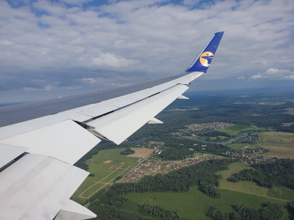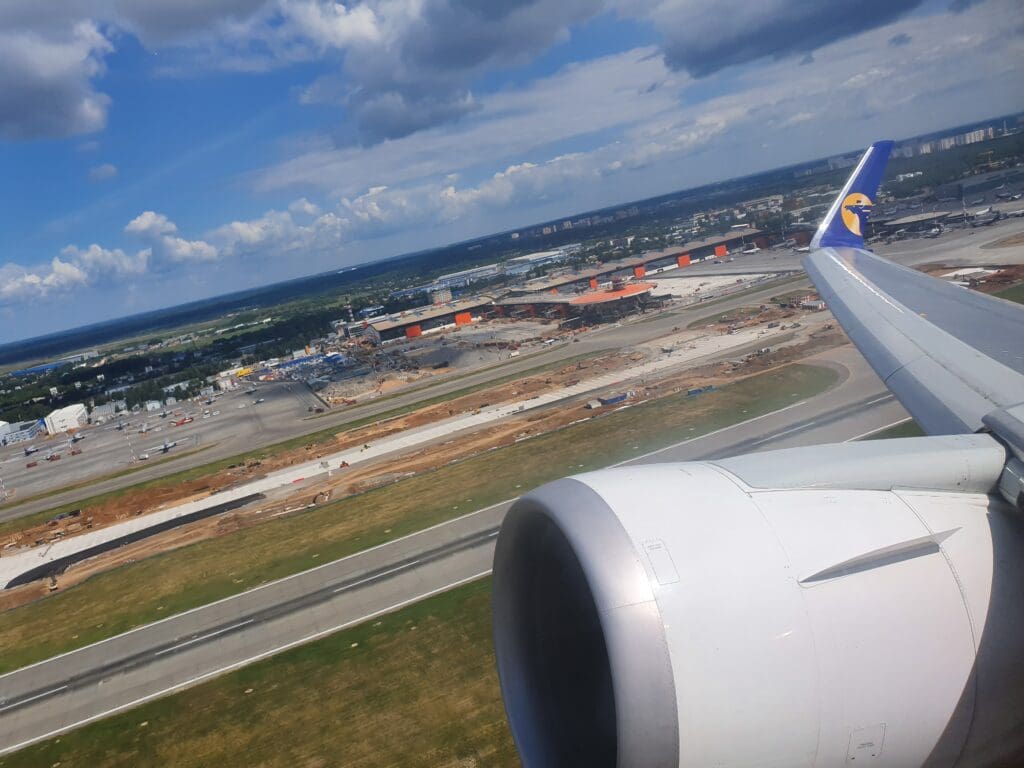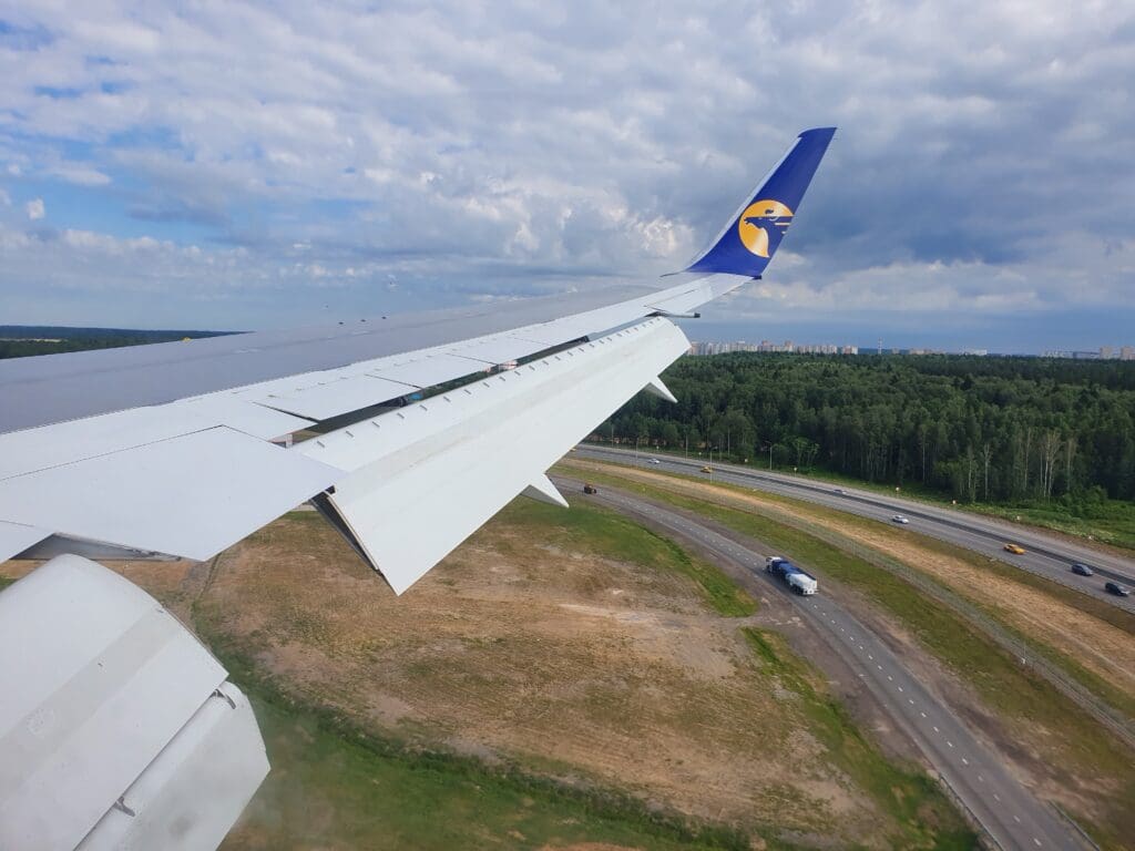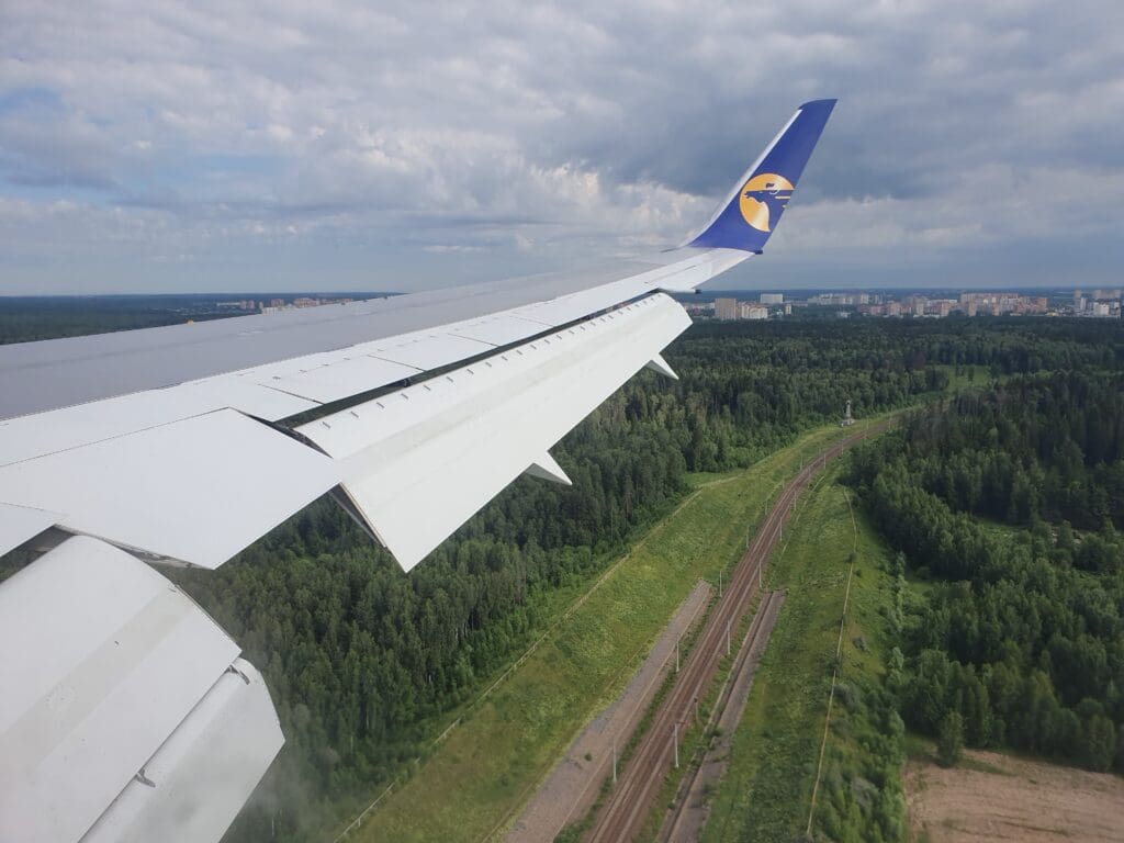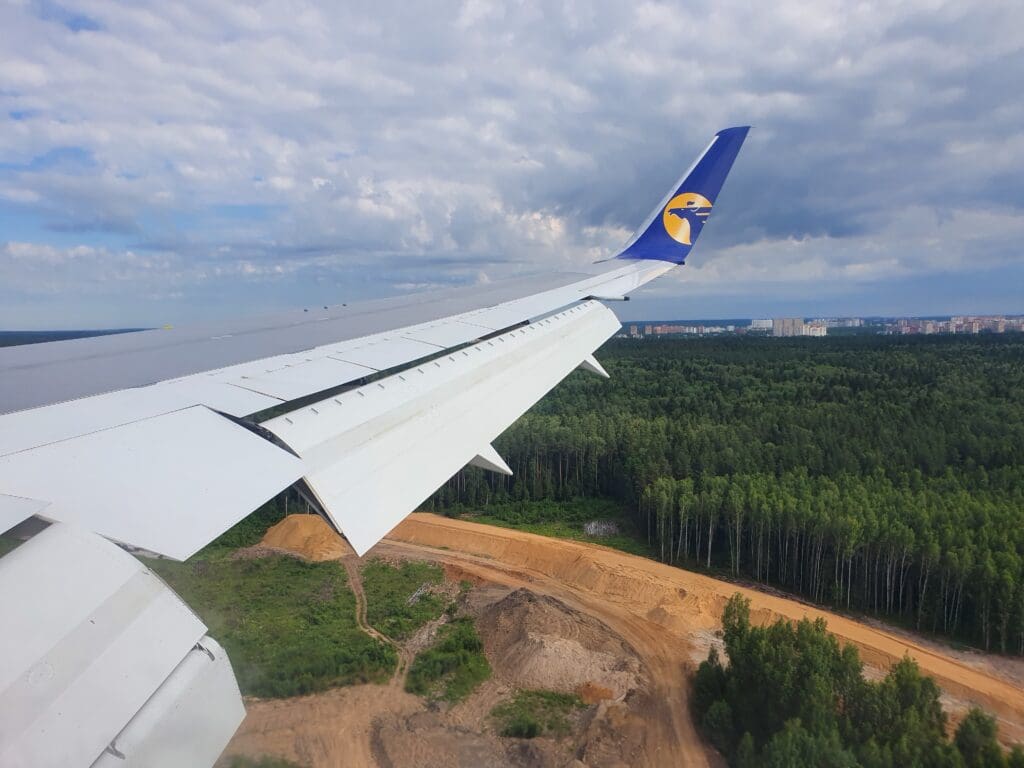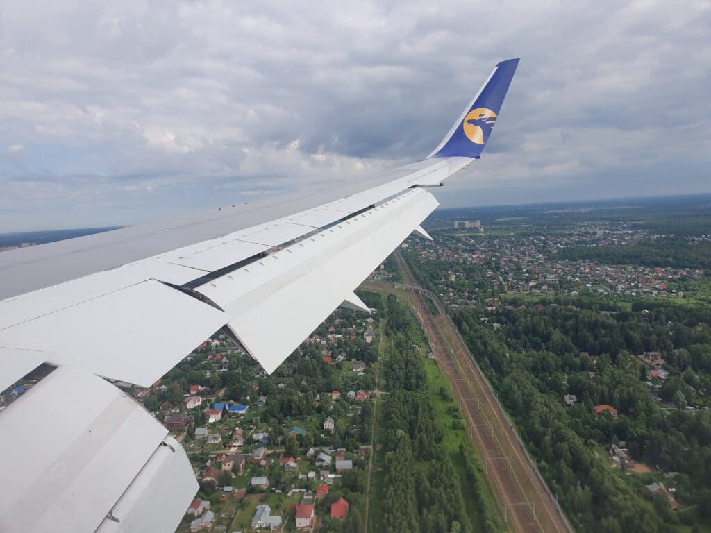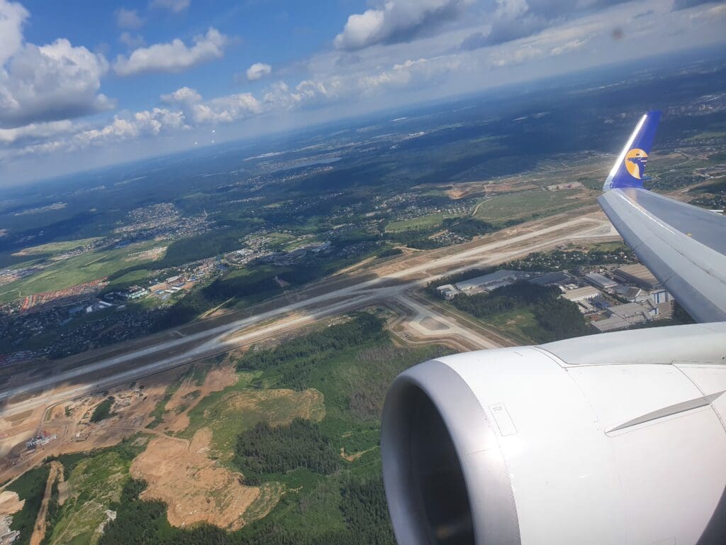 As the Boeing 767 passed through 10,000 feet, the flaps were partially extended and Moscow’s 333-kilometre-long A-107 road came into view. At this point in the flight, those on the opposite side of the aircraft would have most likely been treated to decent views of Russia’s capital. However, from my position, I was instead offered peaceful vistas of green wooded landscapes with the occasional village or small town visible in the middle of these. As the aircraft sank further, several lakes and the Klyazma River which soon turned into the Moscow Canal could be seen at which point the flaps were fully extended as was the landing gear hinting at our imminent arrival.