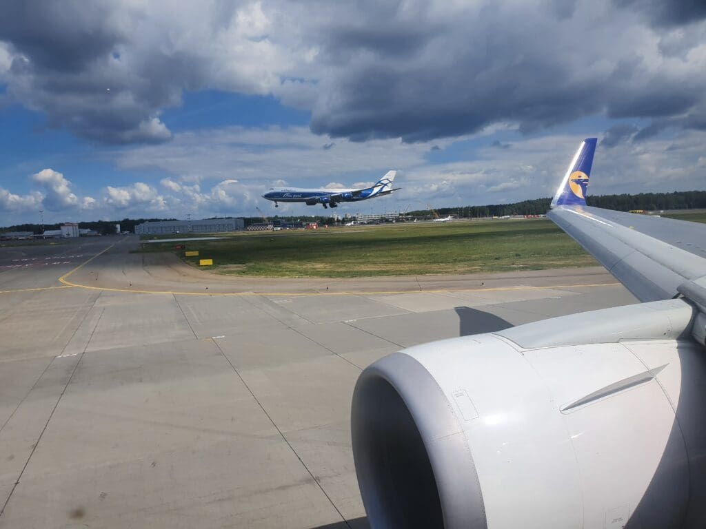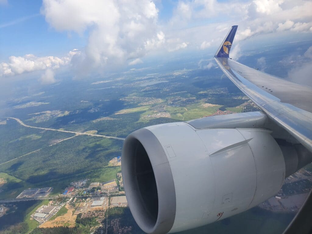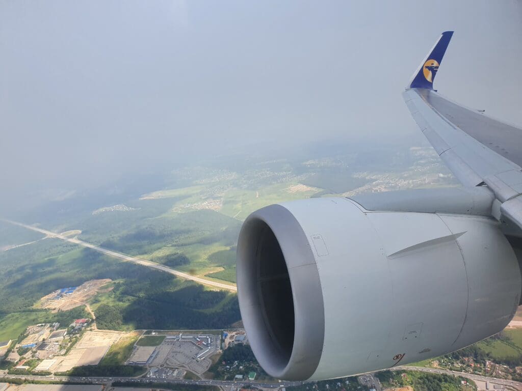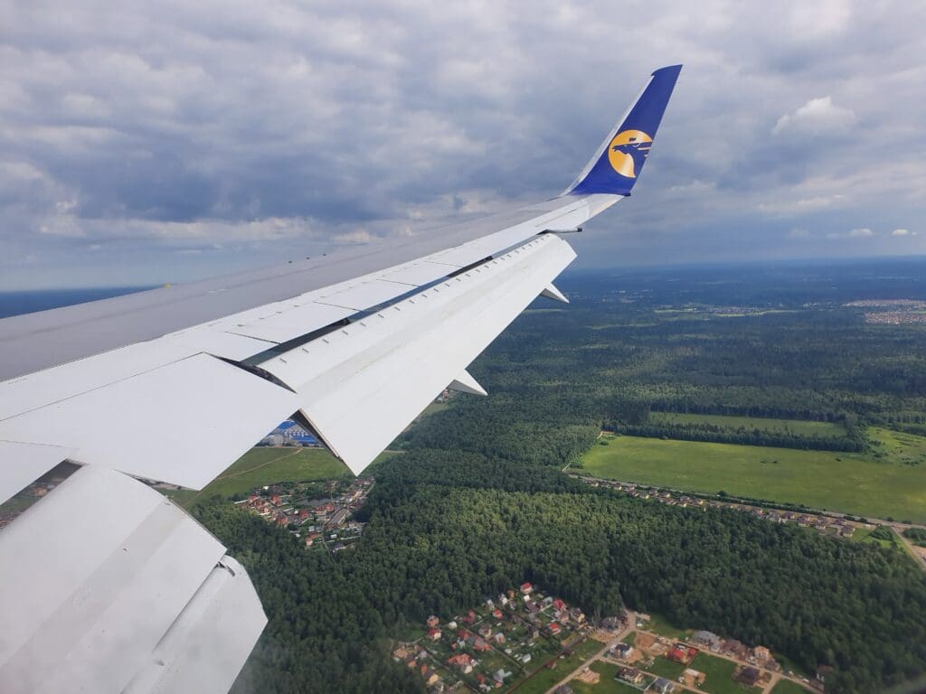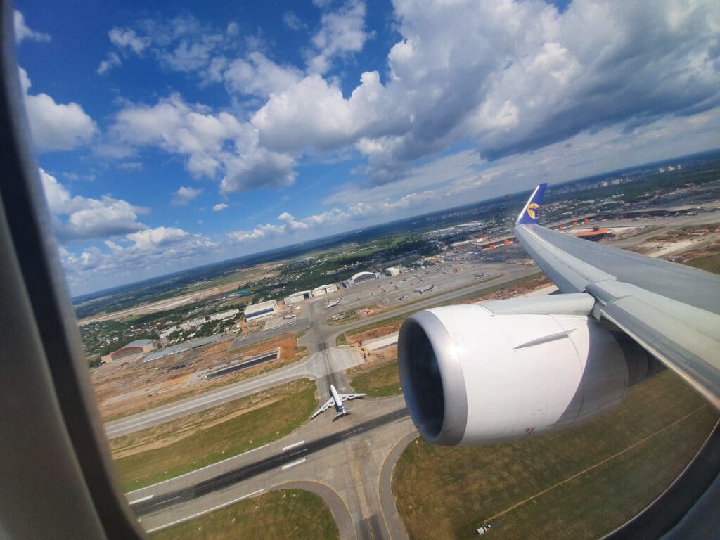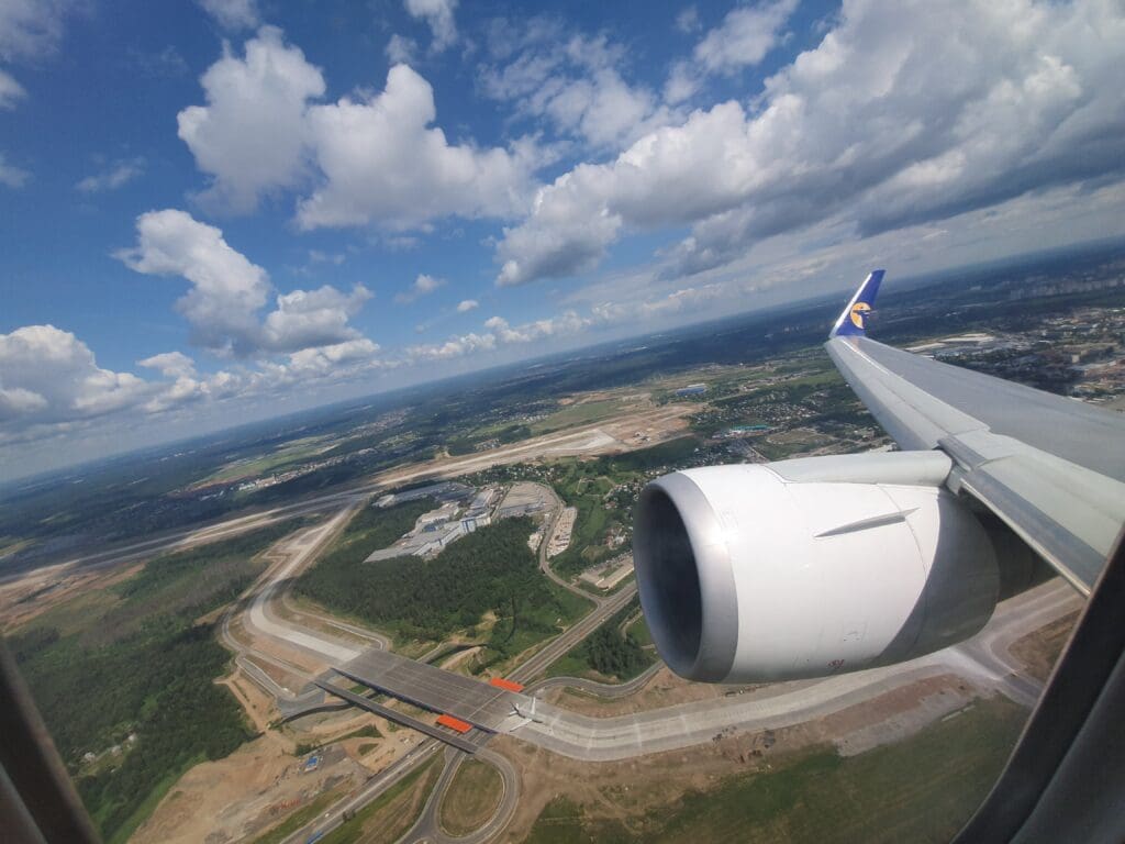 As the Boeing 767 passed through 10,000 feet, the flaps were partially extended and Moscow’s 333-kilometre-long A-107 road came into view. At this point in the flight, those on the opposite side of the aircraft would have most likely been treated to decent views of Russia’s capital. However, from my position, I was instead offered peaceful vistas of green wooded landscapes with the occasional village or small town visible in the middle of these. As the aircraft sank further, several lakes and the Klyazma River which soon turned into the Moscow Canal could be seen at which point the flaps were fully extended as was the landing gear hinting at our imminent arrival.