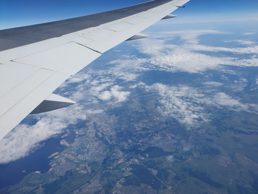 Almost immediately after my tray was taken away, the seat belt signs were reilluminated and pre-recorded announcement rang through the cabin advising passengers to fasten their seatbelts. As if by magic, as soon as this finished, we found ourselves passing through a particularly bumpy patch of clear air turbulence. As we bumped around, very little could be seen aside from fields, woods and the occasional village and small town a long way below. Once the turbulence subsided, the capital of Tatarstan, Kazan, popped into view. Thanks to the gaps in the clouds, the majority of the city was visible and I was able to spot the city’s famous Kul Sharif Mosque, the Kazan Arena as well as the airport just to the north of the city. Meanwhile inside the cabin, once the seatbelt signs had been extinguished again, a comprehensive announcement played regarding the commencement of the onboard duty free service. However, as was the case on the flight from Busan, no one appeared to be interested in this and the duty free trolley ploughed down the rear economy cabin without making a single stop.