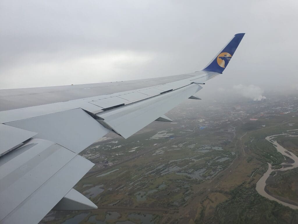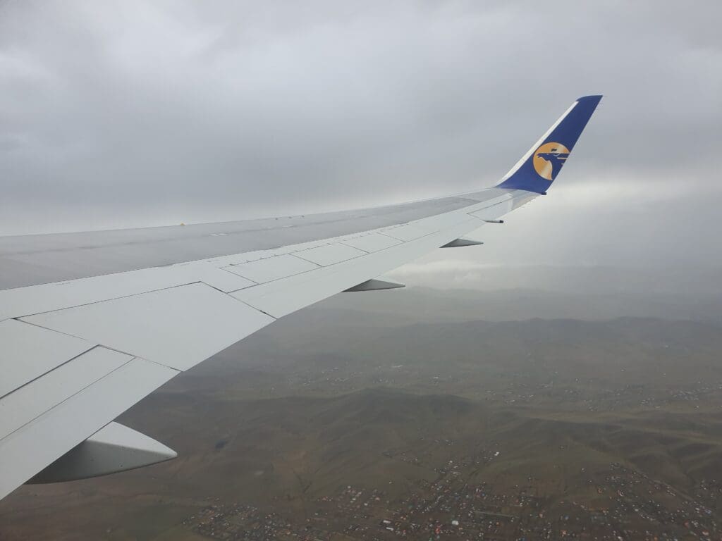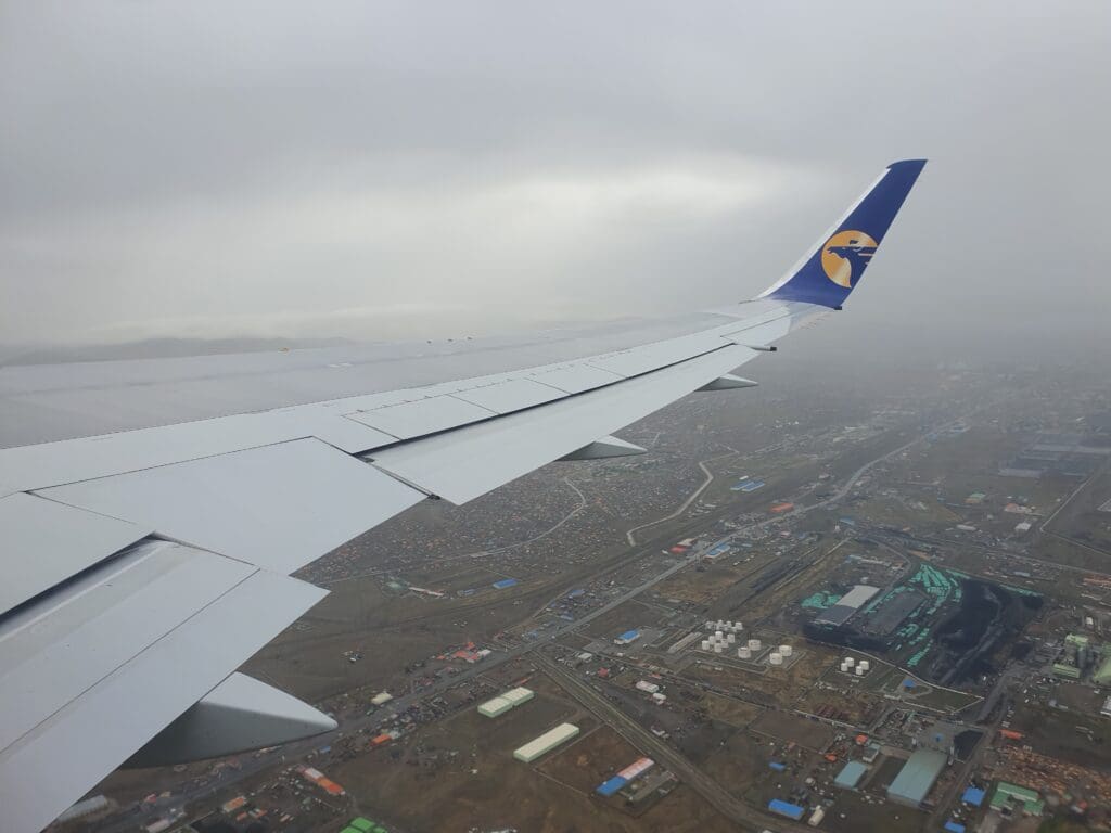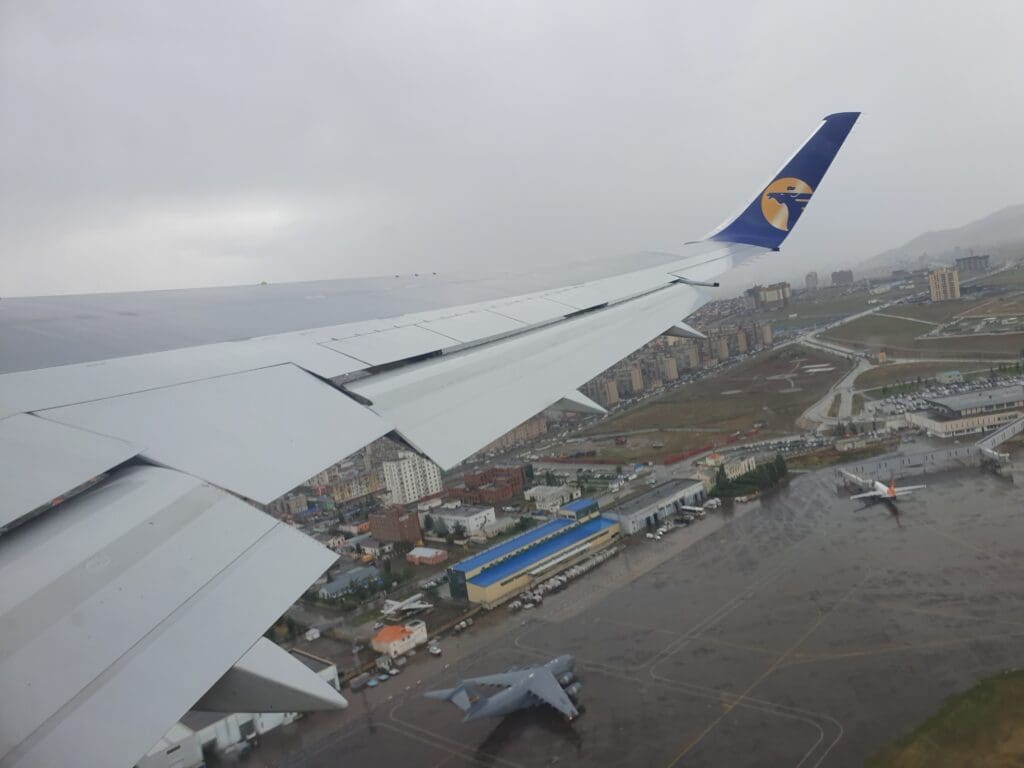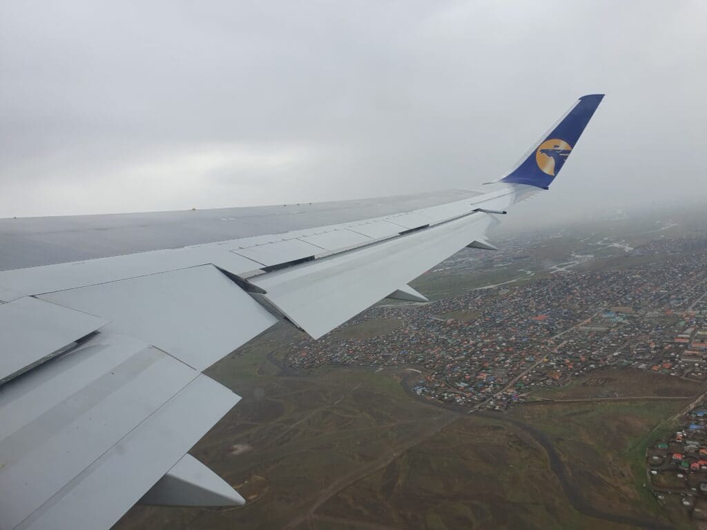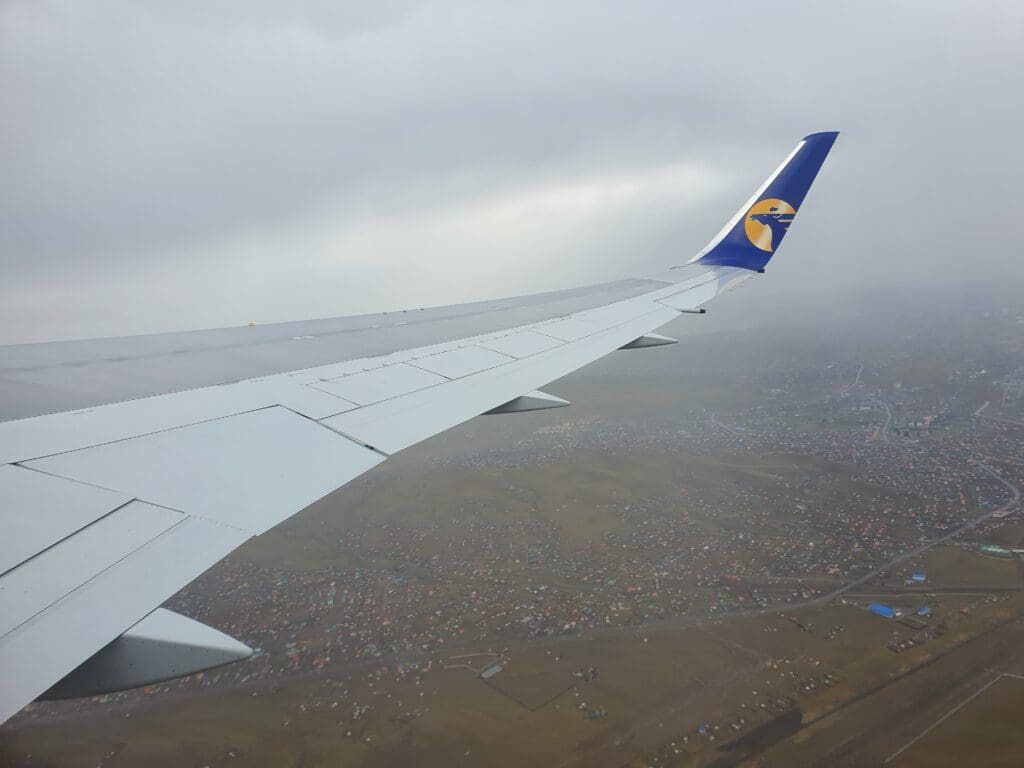 After a six-minute taxi, at 0743 the Boeing 767 turned onto Runway 32 and following a short pause, the two engines powered up as we commenced our powerful journey down the runway. Shaking and swaying somewhat as we bounced down the runway, once the rain droplets cleared, a good view of the airport’s storage and maintenance areas could be had. For those interested in military aviation, there, I spotted a brightly coloured Mongolian Air Force Mil Mi-171 before a host of stored aircraft came into view. These consisted of a trio of Fokker 50s, a pair of Antonov An-2s, a white Soviet-built helicopter and a mysterious green-tailed LET L-410. Following what seemed like a short takeoff roll, the small terminal and ramp could be seen below where the aforementioned Hunnu Air Embraer 190, a Hong Kong-bound Eznis Airways Boeing 737-700 and a USAF Boeing C-17 Globemaster III could all be seen. Moments later the Boeing 767 left the airport behind and crossed over the Tuul River after which residential and industrial areas sped past below.