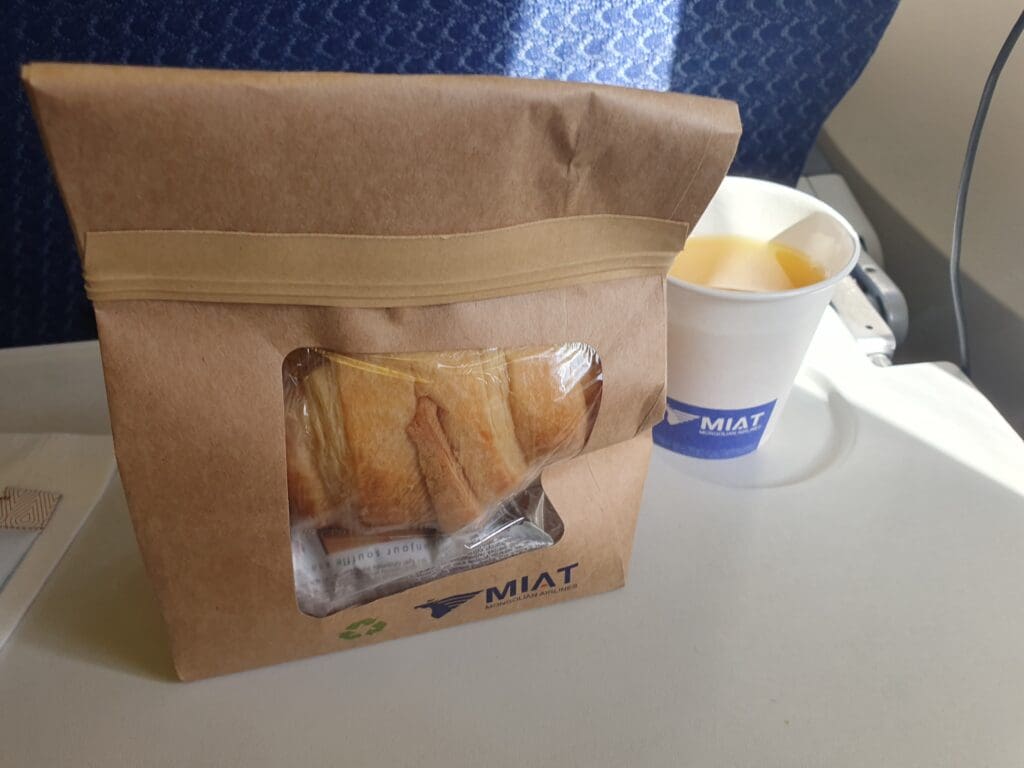 Around 35 minutes after the aircraft’s departure from Ulaanbaatar, as had been the case on the flight from Busan, the crew kicked off the meal service by handing out MIAT-branded honey-roasted peanuts and serviettes. Once the entire aircraft had been served, the crew retreated to the galley and around an hour after our departure, the service continued. Unlike the flight from Busan, this was conducted logically and I was soon handed a paper bag and offered a drink. After opting for an orange juice, this was handed to me in a paper cup by a polite and friendly flight attendant. Turning to the bag, this contained a light breakfast consisting of a pastry that resembled a croissant in shape but had a bread roll texture and contained a chicken and egg filling alongside a coffee-flavoured snack, comparable to a chocolate teacake. All in all, whilst some may have expected a hot breakfast, I found this to be a perfectly acceptable offering considering that a hot meal would be served later on in the flight.