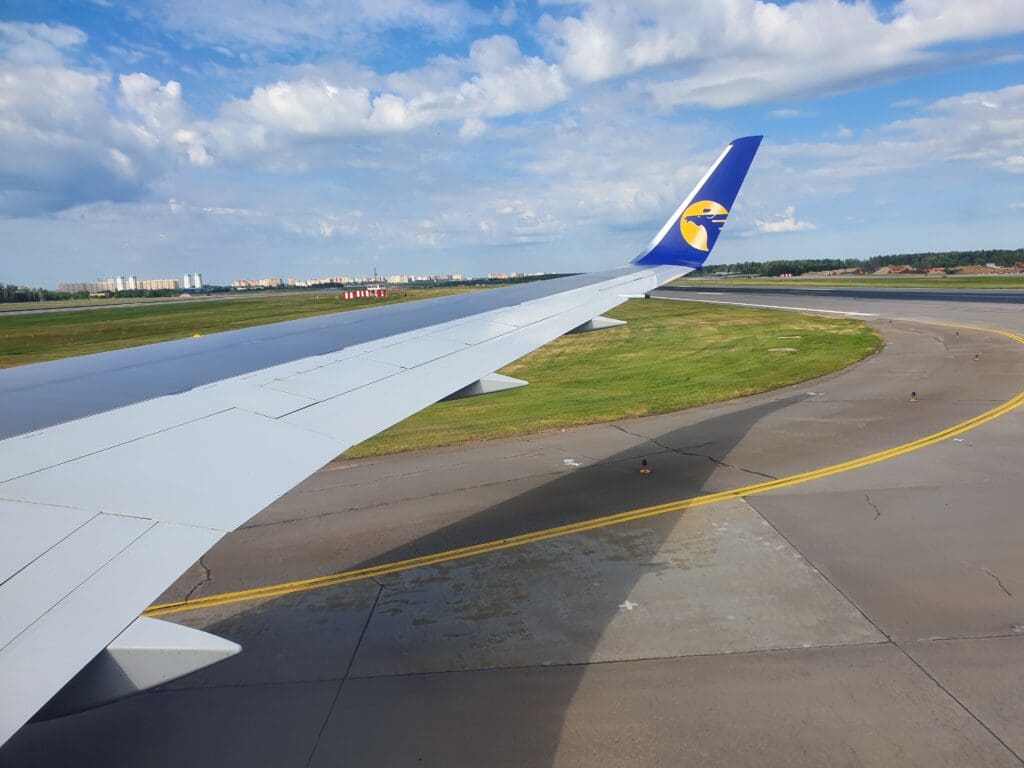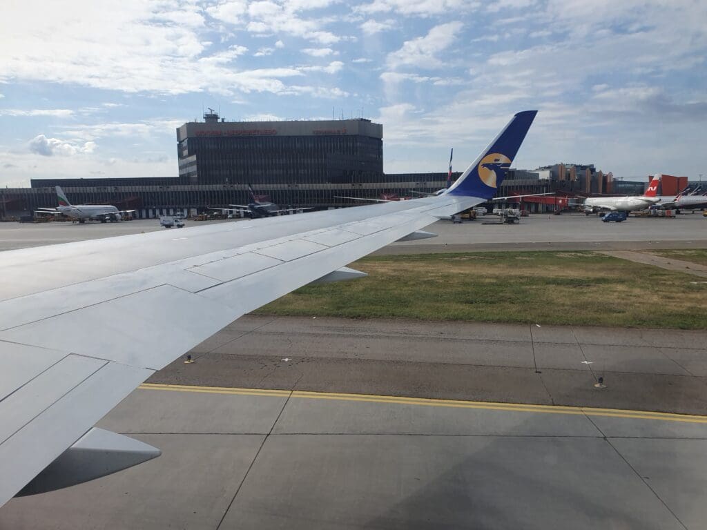 Once the aforementioned Airbus A321 powered up and commenced its taxi to one of Sheremetyevo’s runways, at around 1020, the Boeing 767 left the terminal behind and its two large engines spooled up with plenty of humming, whiring and vibration. After a few moments, the Boeing propelled itself forward and commenced what turned out to be a pleasantly short taxi to Runway 24L. As we made our way to the runway, a host of relatively interesting aircraft could be seen. These included a Rossiya Airlines Boeing 747-400, a Nordwind Airlines Boeing 777-200ER sporting a hybrid Nordwind-Singapore Airlines colour scheme and an Embraer 190 operated by Russian carrier Pegus Fly. By 1029, the Boeing 767 made it onto the runway, however, adding insult to our delay, the aircraft was required to hold for two arrivals on the parallel runway. These consisted of an Aeroflot Airbus A320 and an AirBridgeCargo Boeing 747-8F touching down at its home base after a long flight from Shanghai. Finally at 1031, it was our turn to take to the skies and so the aircraft commenced what seemed like a short and powerful takeoff roll. After speeding past an Aeroflot Sukhoi Superjet waiting to cross the runway, the Boeing rotated into the skies, bringing an end to its short stay on the ground in Moscow.