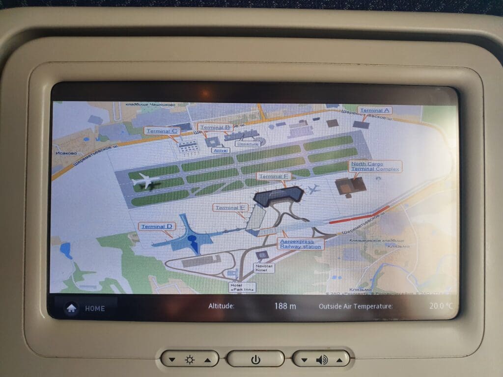 As the aircraft climbed, a good bird’s eye view of a selection of stored Aeroflot jets, the majority of which appeared to be Sukhoi Superjets, could be seen before the airport’s new runway came into sight. Interestingly, an engineless ex-Aeroflot Ilyushin Il-96 could be seen standing on the sole taxiway leading to this, perhaps in an attempt to guard this from any accidental departures. After leaving the airport behind, the aircraft shook a little before passing through a patch of clouds. Once through these, the seatbelt signs were extinguished at which point I drifted into a light sleep as the aircraft climbed up to its cruising altitude of 36,000 feet.