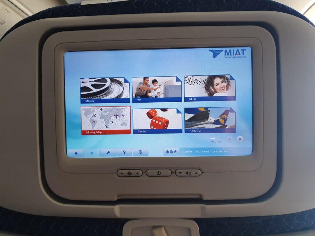 Turning to the content, this is where the system managed to redeem itself somewhat. Considering that, at the time, this particular aircraft was the only operational aircraft in MIAT’s fleet that featured inflight entertainment screens, the system featured a reasonable selection of items. The majority of films came in the form of both new and old Hollywood blockbusters and a small number of Mongolian hits, although surprisingly, films from China, Europe, Korea or Russia were totally absent. Away from films, I counted a grand total of 27 television programmes, 70 albums, 10 games, and of course, a good old moving map channel. Considering the omnipresence of advertisements for the Trade and Development Bank across MIAT and Ulaanbaatar Airport, I was not overly surprised to find that all visual content was preceded by a couple of adverts for this bank.