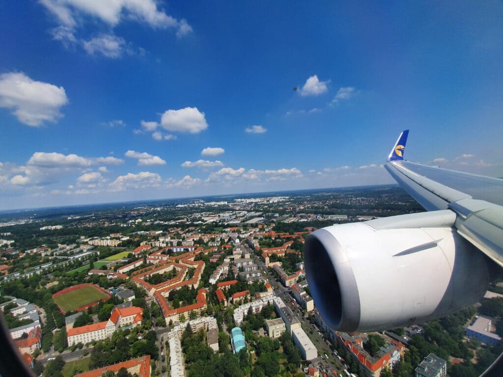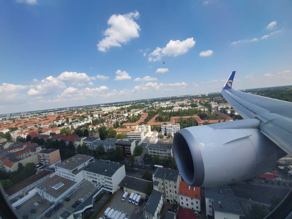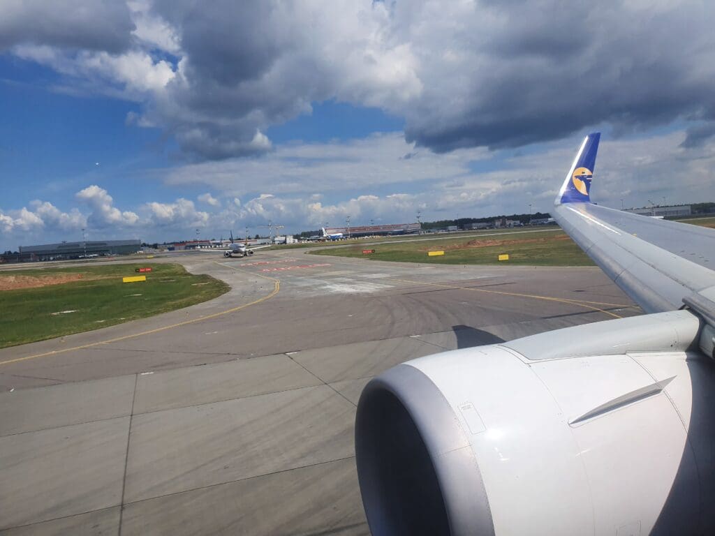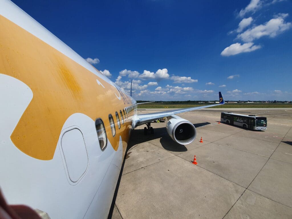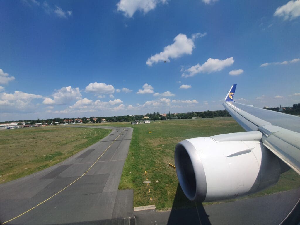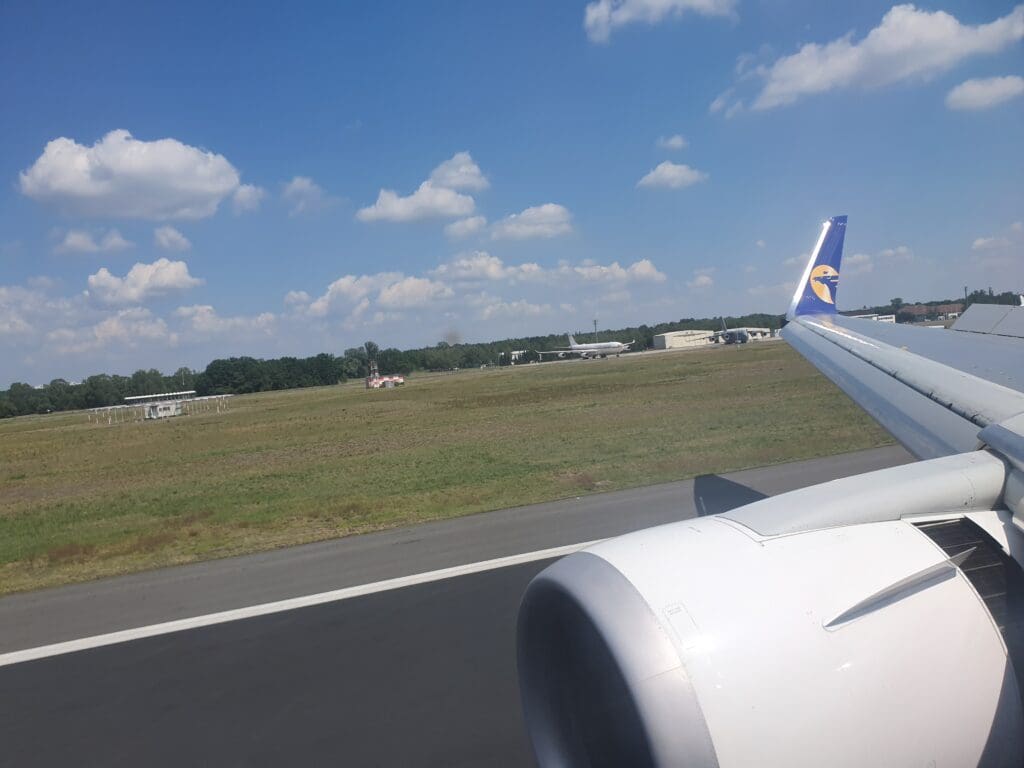Following some gentle breaking, the purser welcomed all to Berlin in Mongolian and English, ending their announcement with an apology for the delay. At this point, despite realising the likelihood of missing my flight, I hoped that if immigration and baggage collection were quick, and the ground staff at Tegel were willing to allow me to take my fairly small suitcase onboard the aircraft as hand luggage, I would be able to make my onward flight. However, within a few minutes of our arrival, my heart sunk a little as, rather than taxiing up to the terminal, the aircraft turned right and slowly eased its way into remote Stand 27. In addition, it appeared as if the ground staff were not yet ready for our arrival as it took a grand total of ten minutes for the L1 door to be reopened and disembarkation to commence. Perhaps serving to further anger passengers at the aircraft’s late arrival, or to speed out disembarkation once this commenced, the same Taylor Swift song rang out loudly on repeat. Fortunately, just before a riot kicked off, at 1205 the L1 door was opened and disembarkation commenced. After thanking the crew once again, I headed down the airstairs and into the pleasant lunch time sunshine.