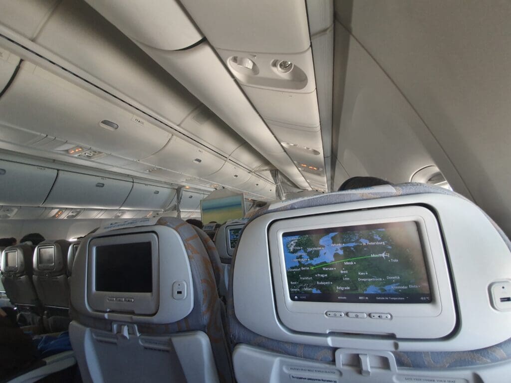 As the crew handed out drinks, some inflight drama occurred when the passenger next to me got rather annoyed when the crew failed to give him a whole 1.5-litre bottle of water, instead giving him two paper cups of this. Whilst I do not speak Russian, during the whole fiasco this passenger kept turning towards me and muttering several words in Russian. Eventually, the crew finally ceded to his demands and brought a small plastic bottle of water from Business. Turning to the flight’s progress, as with most flights between Moscow and destinations across Western Europe, after leaving the Russian capital, the Boeing 767 headed almost directly west before entering Belarusian airspace after passing Smolensk. However, unfortunately, by this tim,e thick clouds beneath the aircraft blocked any view of the ground beneath the aircraft during our 25-minute crossing of the country before heading into Lithuanian and then Polish airspace. Seeing as my excessive photo-taking was rapidly draining my phone’s battery, as the aircraft headed westwards I turned to the seatback USB port however unfortunately this did not seem to work.