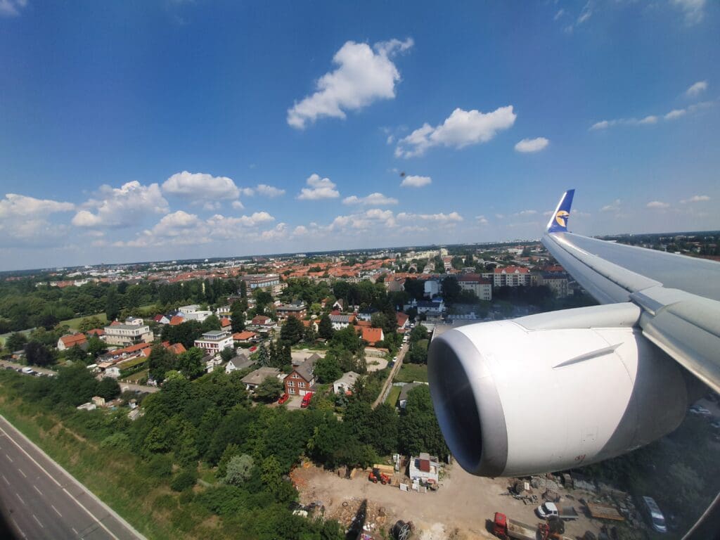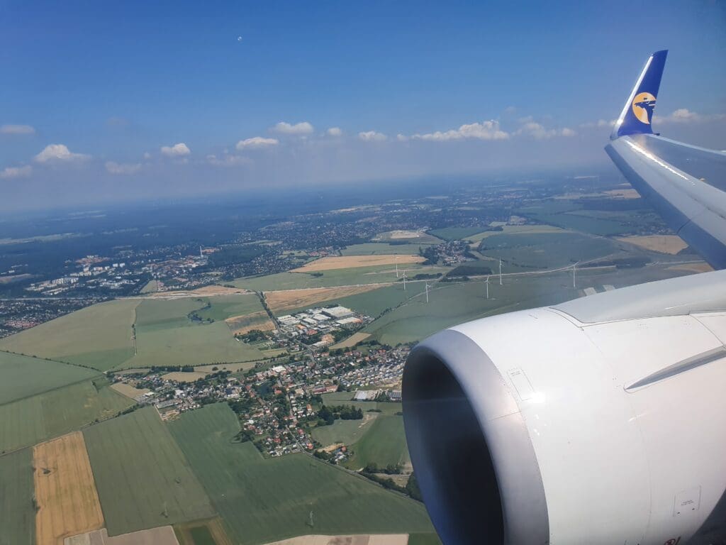 Upon returning to my seat the aircraft was still a fair way from landing with the green countryside of western Poland seeming to be some distance beneath the aircraft. Nevertheless at this time the crew could be seen passing through the cabin conducting their final pre-arrival checks, ensuring this was secure for the aircraft’s arrival. Turning my attention back outside, around fifteen minutes after the Boeing 767 had commenced its descent, the aircraft crossed over the River Oder which at this point in its course serves to mark the border between Germany and Poland. Once firmy over Germany’s equally green countryside, the aircraft made a gentle turn to the south prior to turning west again to set us on course for Berlin Tegel’s Runway 26R. As we headed towards the ground, the aircraft’s speedbrakes were partially extended followed by the flaps, meanwhile below a large and modern heliport, yet one that was devoid of helicopters could be seen passing by. Later research revealed this to be a helicopter base for the local squadron of helicopters operated by Germany’s Federal Police, located just to the northeast of Berlin.
