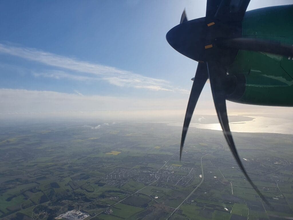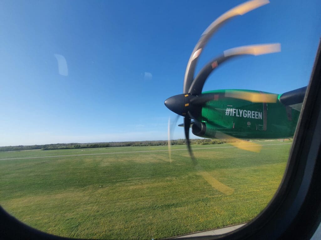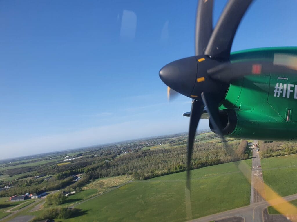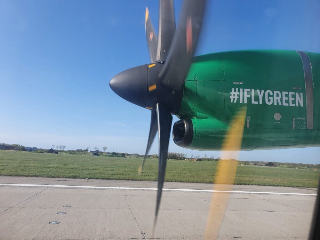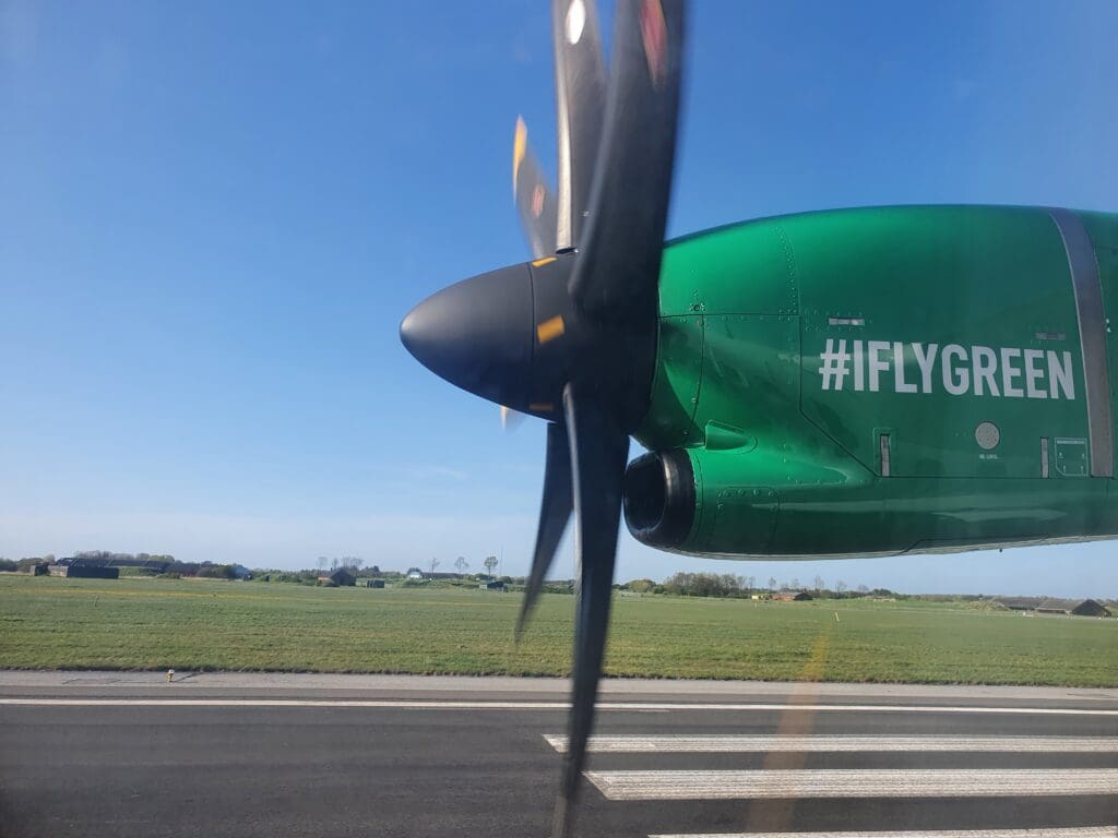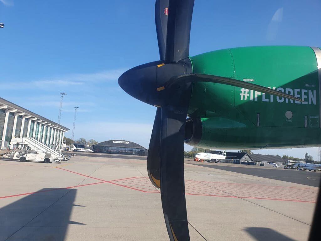 After snapping a few photos of the shining ATR 72 that would power us through the sunny Danish skies, I made my way up the aircraft’s built-in steps before entering the small galley at the rear of the aircraft. As soon as I entered the aircraft I received a warm and friendly greeting in Danish, after which I turned left and made my way into the passenger cabin. Inside, DAT’s ATR 72s feature a standard configuration for the aircraft, with these coming complete with 72 thin and modern seats arranged in a 2-2 configuration. On this aircraft, I found each of these to be covered in a dark blue (faux?) leather and topped with disposable antimacassars promoting DAT’s thirtieth anniversary and commitments to sustainability, with some of these ingeniously featuring a QR code that linked to the airline’s inflight magazine. Having ended up being one of the first passengers to board the aircraft, most seats remained available as I trundled through the cabin and I ended up picking Seat 4F which allowed for a good view of both the world below and the six-blade propellers of the ATR 72’s starboard engine.