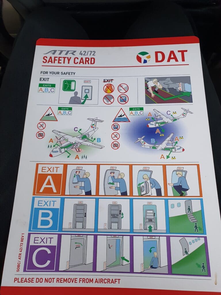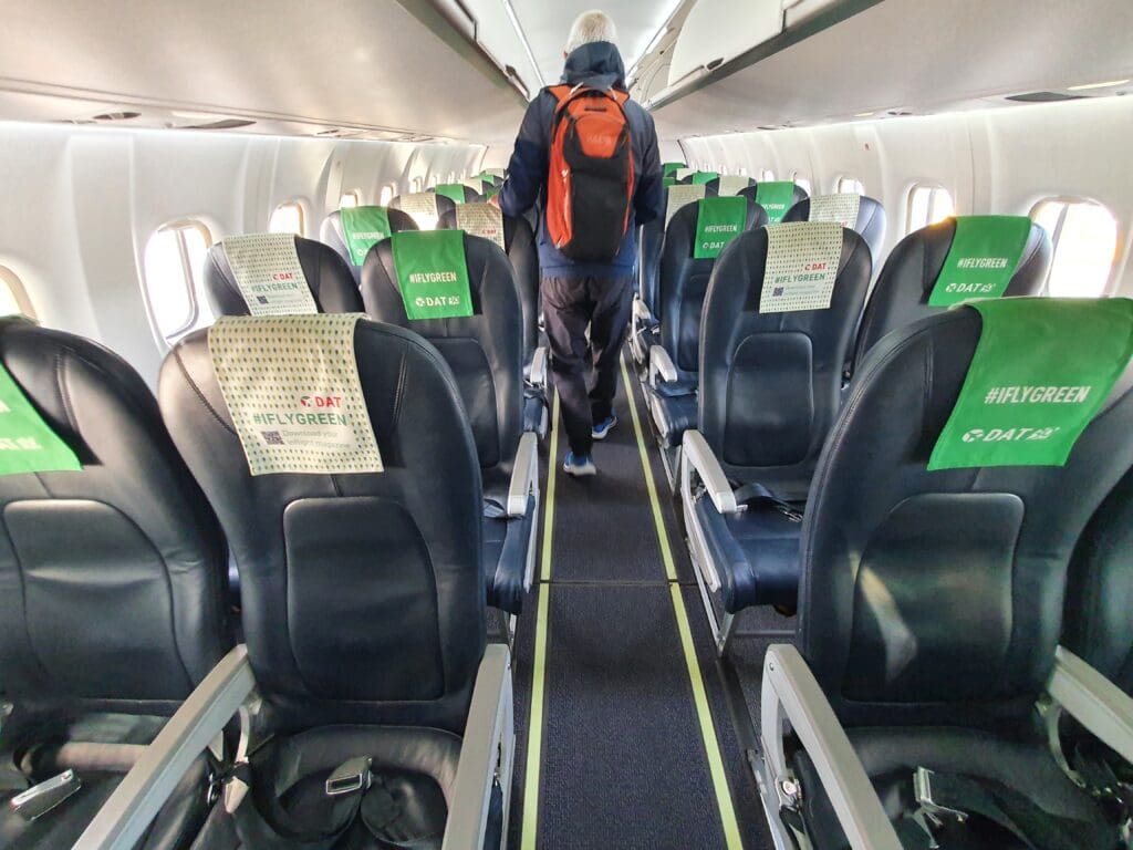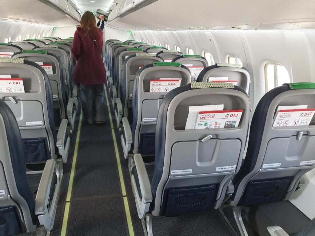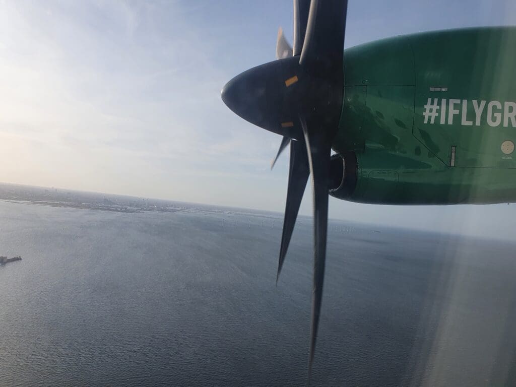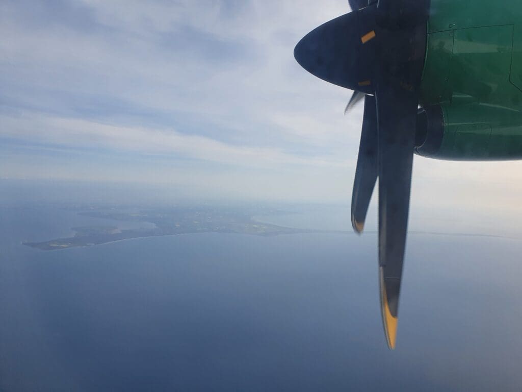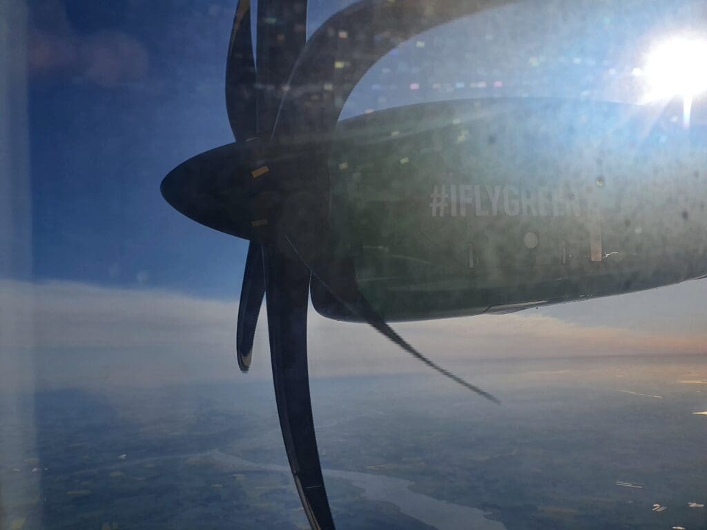 After snapping a few photos of the shining ATR 72 that would power us through the sunny Danish skies, I made my way up the aircraft’s built-in steps before entering the small galley at the rear of the aircraft. As soon as I entered the aircraft I received a warm and friendly greeting in Danish, after which I turned left and made my way into the passenger cabin. Inside, DAT’s ATR 72s feature a standard configuration for the aircraft, with these coming complete with 72 thin and modern seats arranged in a 2-2 configuration. On this aircraft, I found each of these to be covered in a dark blue (faux?) leather and topped with disposable antimacassars promoting DAT’s thirtieth anniversary and commitments to sustainability, with some of these ingeniously featuring a QR code that linked to the airline’s inflight magazine. Having ended up being one of the first passengers to board the aircraft, most seats remained available as I trundled through the cabin and I ended up picking Seat 4F which allowed for a good view of both the world below and the six-blade propellers of the ATR 72’s starboard engine.