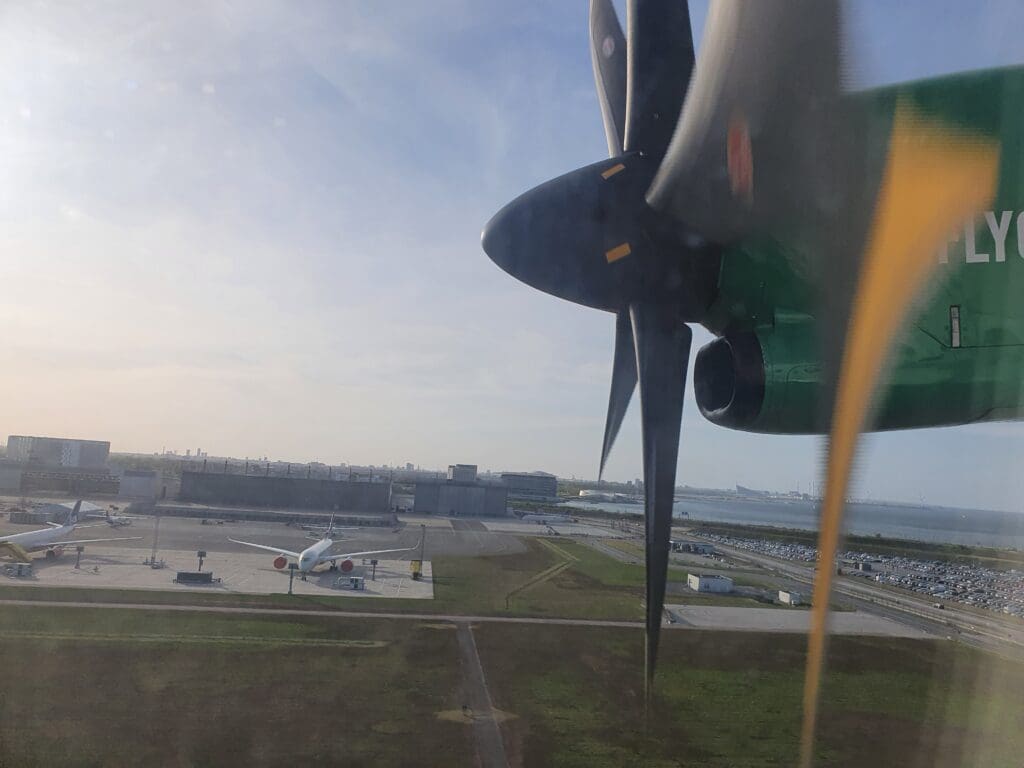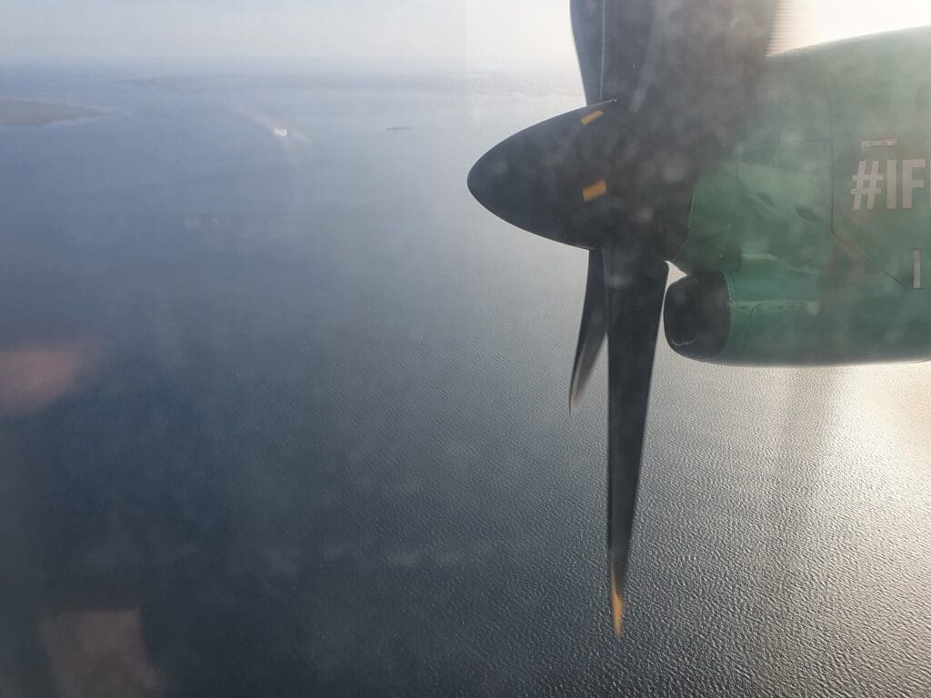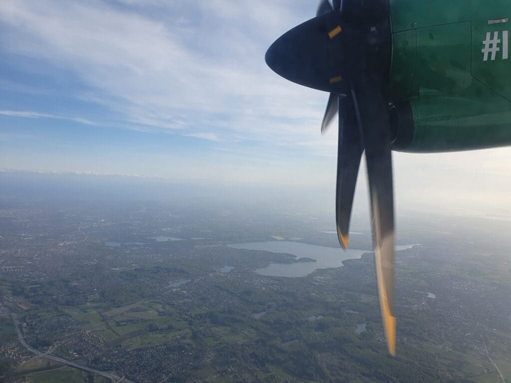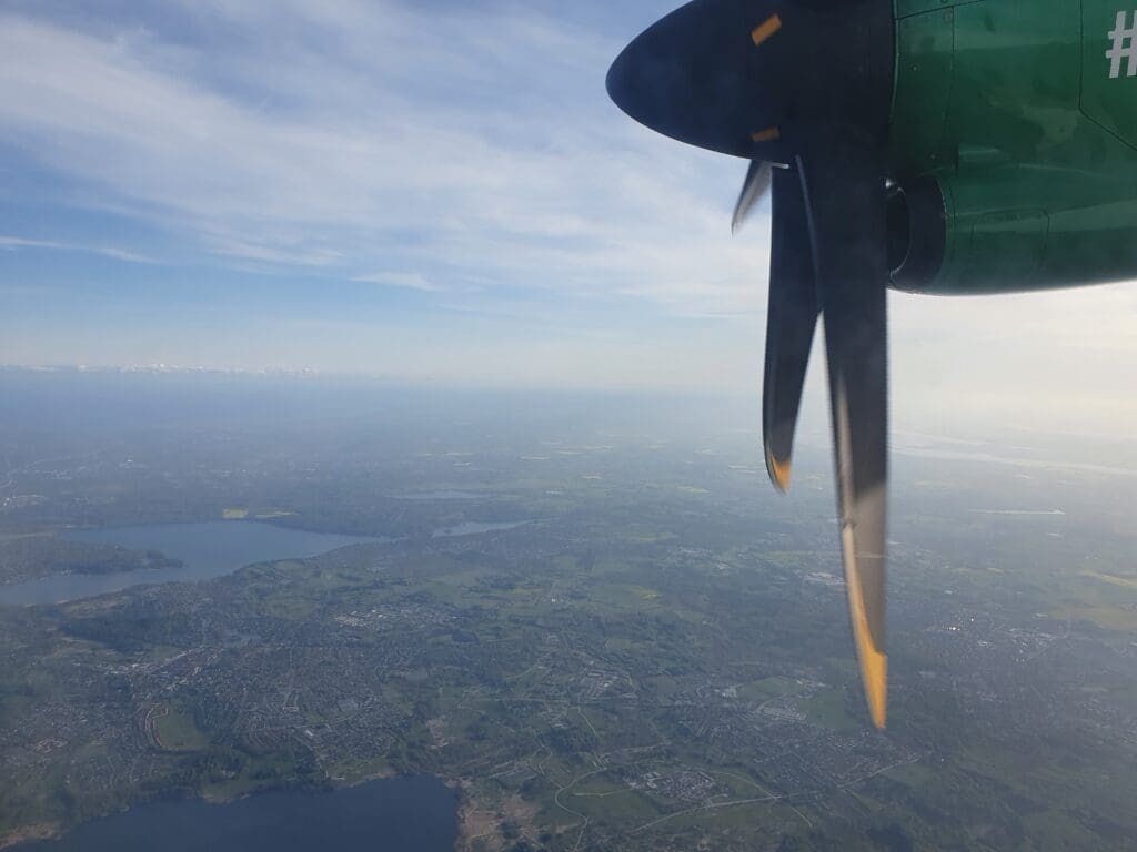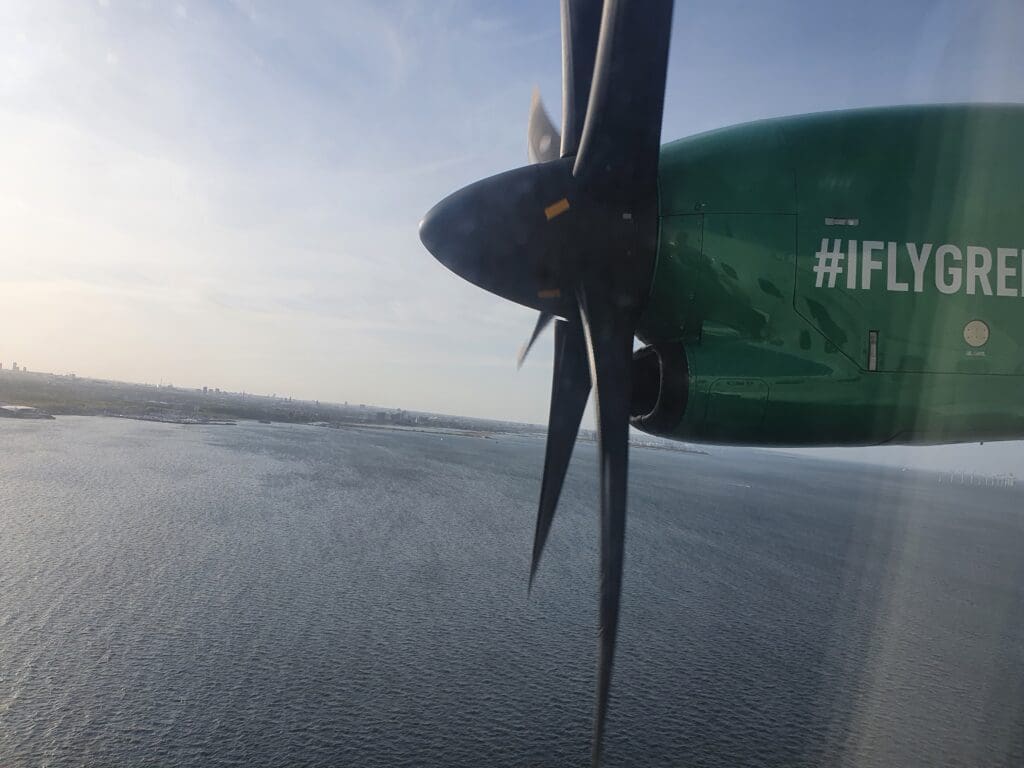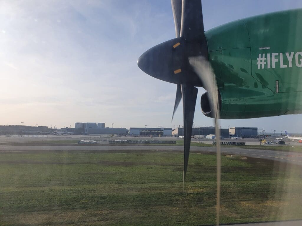 After snapping a few photos of the shining ATR 72 that would power us through the sunny Danish skies, I made my way up the aircraft’s built-in steps before entering the small galley at the rear of the aircraft. As soon as I entered the aircraft I received a warm and friendly greeting in Danish, after which I turned left and made my way into the passenger cabin. Inside, DAT’s ATR 72s feature a standard configuration for the aircraft, with these coming complete with 72 thin and modern seats arranged in a 2-2 configuration. On this aircraft, I found each of these to be covered in a dark blue (faux?) leather and topped with disposable antimacassars promoting DAT’s thirtieth anniversary and commitments to sustainability, with some of these ingeniously featuring a QR code that linked to the airline’s inflight magazine. Having ended up being one of the first passengers to board the aircraft, most seats remained available as I trundled through the cabin and I ended up picking Seat 4F which allowed for a good view of both the world below and the six-blade propellers of the ATR 72’s starboard engine.