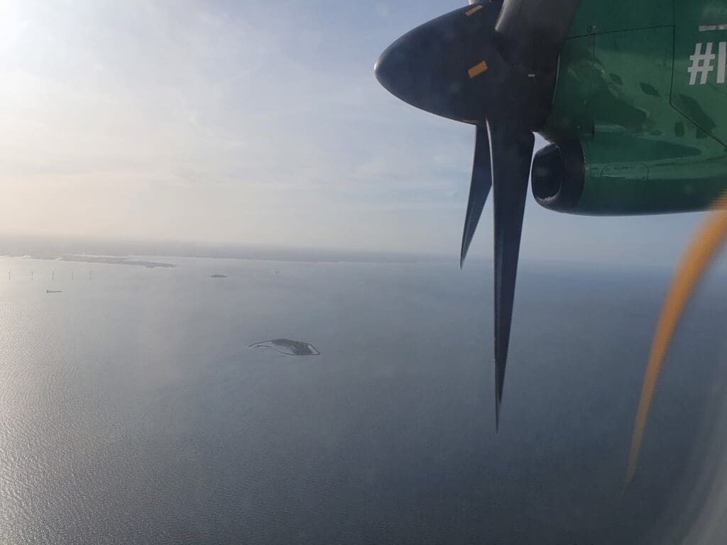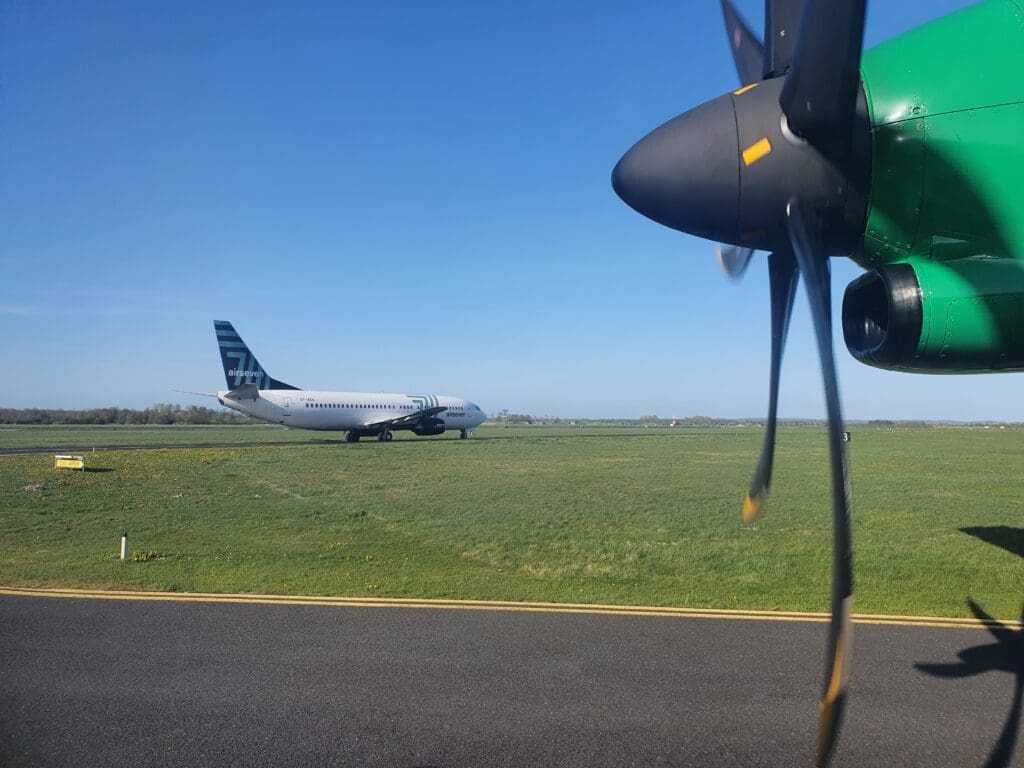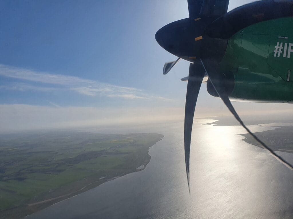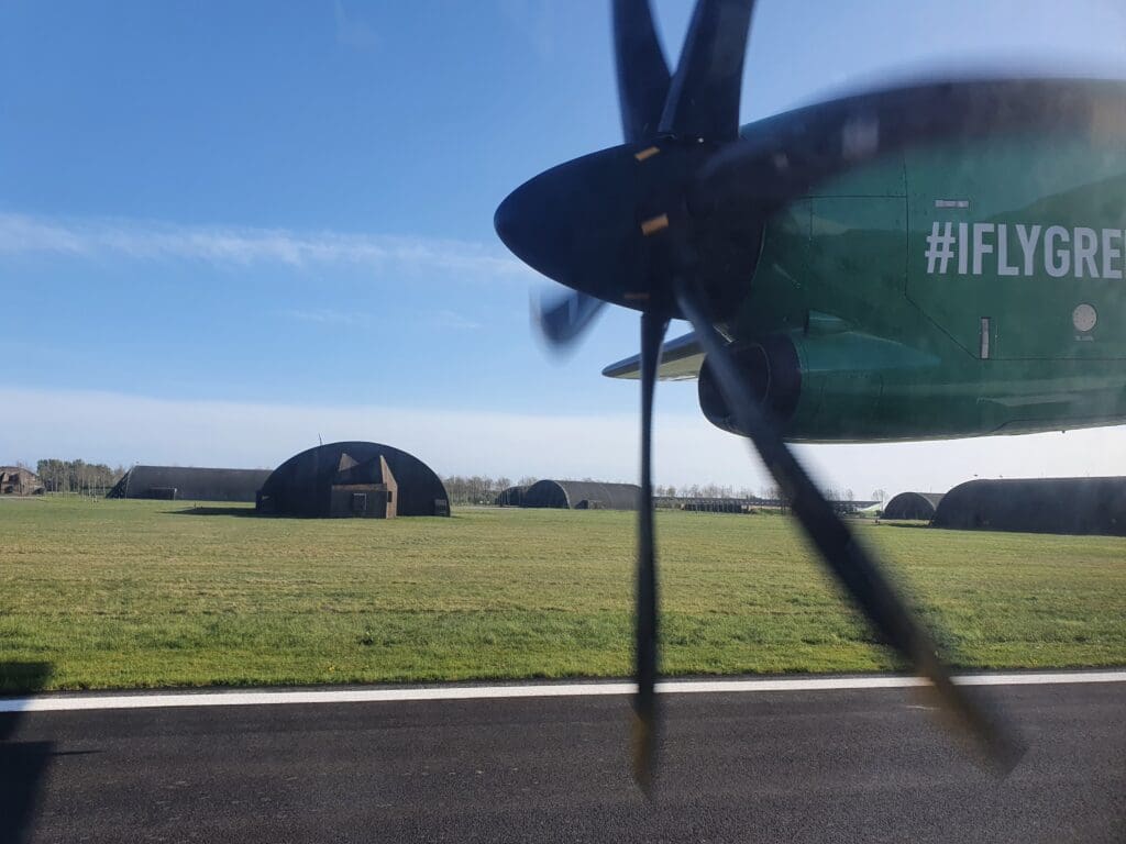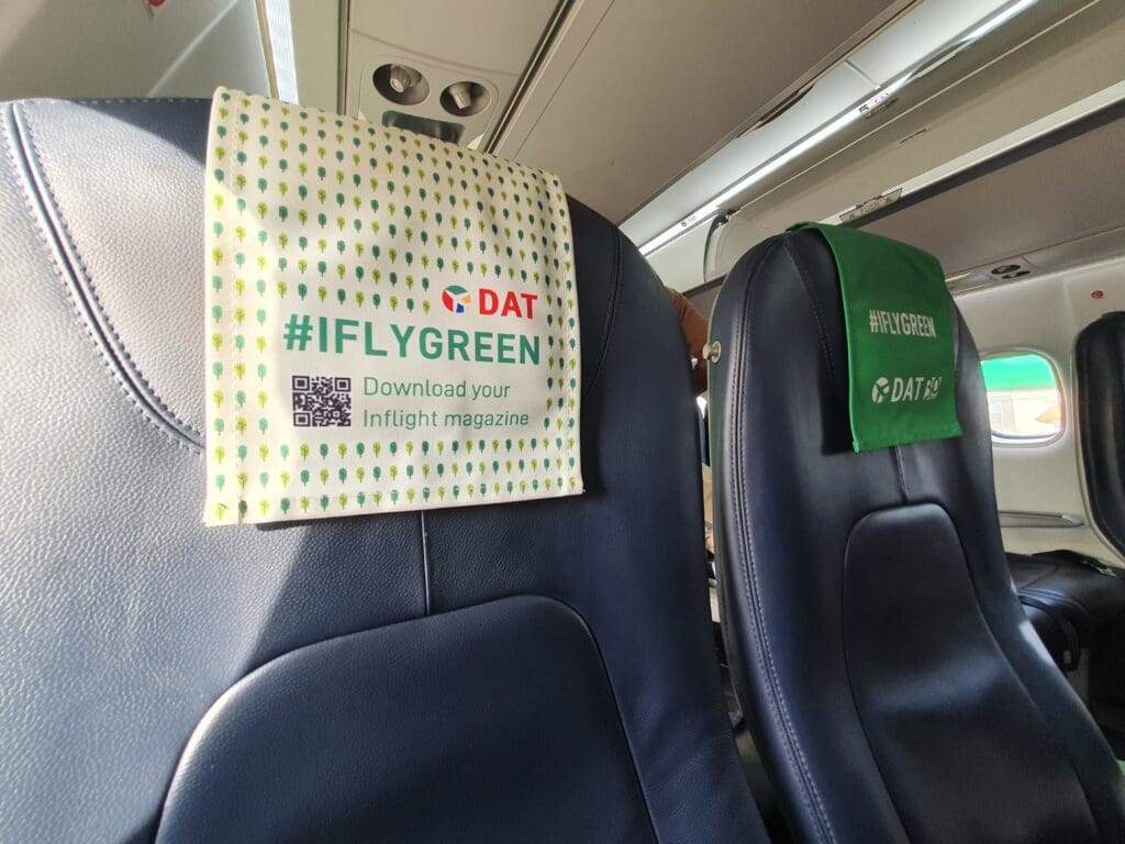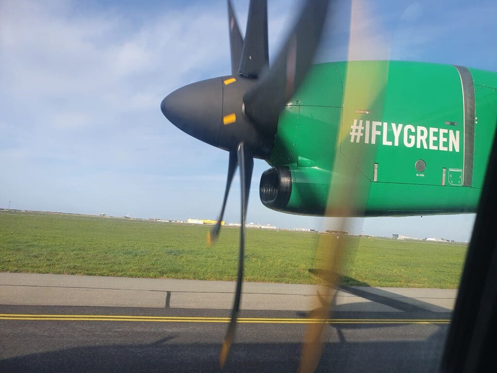 After snapping a few photos of the shining ATR 72 that would power us through the sunny Danish skies, I made my way up the aircraft’s built-in steps before entering the small galley at the rear of the aircraft. As soon as I entered the aircraft I received a warm and friendly greeting in Danish, after which I turned left and made my way into the passenger cabin. Inside, DAT’s ATR 72s feature a standard configuration for the aircraft, with these coming complete with 72 thin and modern seats arranged in a 2-2 configuration. On this aircraft, I found each of these to be covered in a dark blue (faux?) leather and topped with disposable antimacassars promoting DAT’s thirtieth anniversary and commitments to sustainability, with some of these ingeniously featuring a QR code that linked to the airline’s inflight magazine. Having ended up being one of the first passengers to board the aircraft, most seats remained available as I trundled through the cabin and I ended up picking Seat 4F which allowed for a good view of both the world below and the six-blade propellers of the ATR 72’s starboard engine.