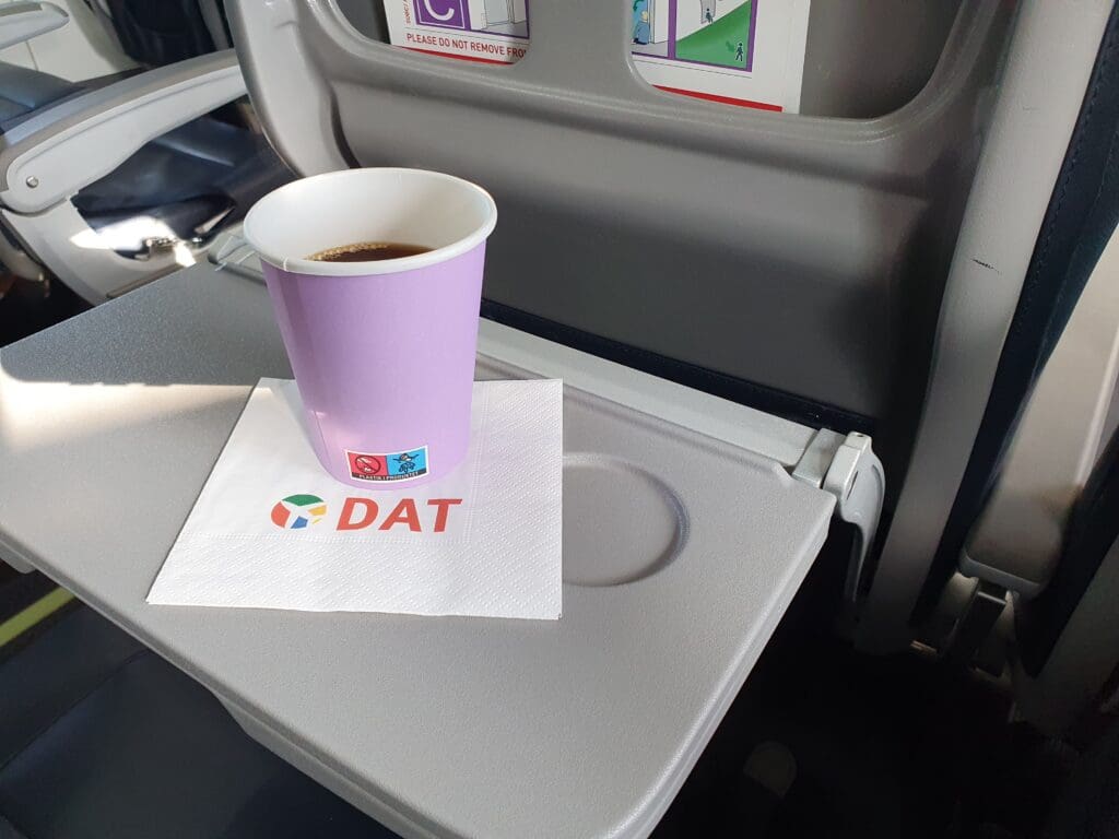 After leaving the vast expanse of Aalborg Airport behind, the aircraft climbed out over the flat green fields that surround this, almost immediately banking to the left before rolling out on a southeasterly heading that would take the turboprop to Copenhagen. Contrary to the Captain’s warning, the promise of turbulence never materialised and around three minutes after taking to the skies the seatbelts were extinguished at which point the usual announcement regarding keeping these fastened whilst seated was undertaken. This ended with a quick mention of the inflight service which included a complimentary hot beverage of either tea or coffee. At this point, seeing as nobody was sitting behind me, I opted to recline my seat which made the poor legroom slightly more tolerable. A short time later, one of the flight attendants politely asked me in Danish whether I would like tea or coffee, followed by milk and sugar. A minute or so later, the flight attendant lowered the tray table of the aisle seat and placed a DAT-branded serviette down upon this, returning a short time later with a cup of coffee.