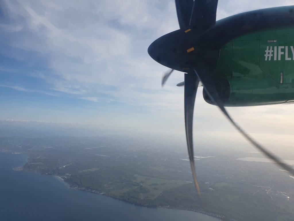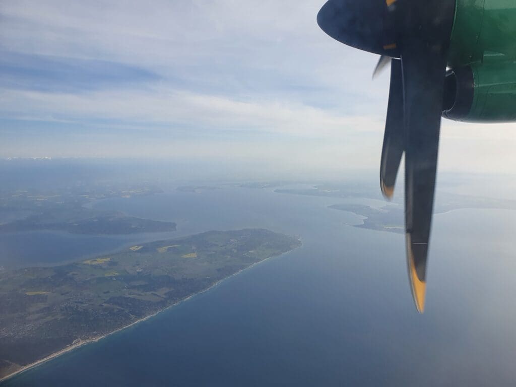 That evening, the load for the ride over to Copenhagen was to be very light, with no more than twenty passengers onboard. Thus, the ‘boarding complete’ announcement was made a very short time after boarding commenced. At 1745, the Captain performed a quick welcome speech in Danish and English which featured the usual thanks, a mention of our 35-minute flight time and a warning that we could expect some turbulence immediately following our departure although the rest of the flight would be smooth. During this, the flight attendant stationed at the front of the aircraft passed through the cabin ensuring all was in place for departure before taking their position in the aisle and undertaking a safety demonstration as a pre-recorded announcement rang out. These instructions were given first in Danish, followed by Australian-accented English. As this demonstration was underway, the two Pratt & Whitney Canada PW127M engines commenced their seemingly quiet start-up procedure before the propellers whirled into life.