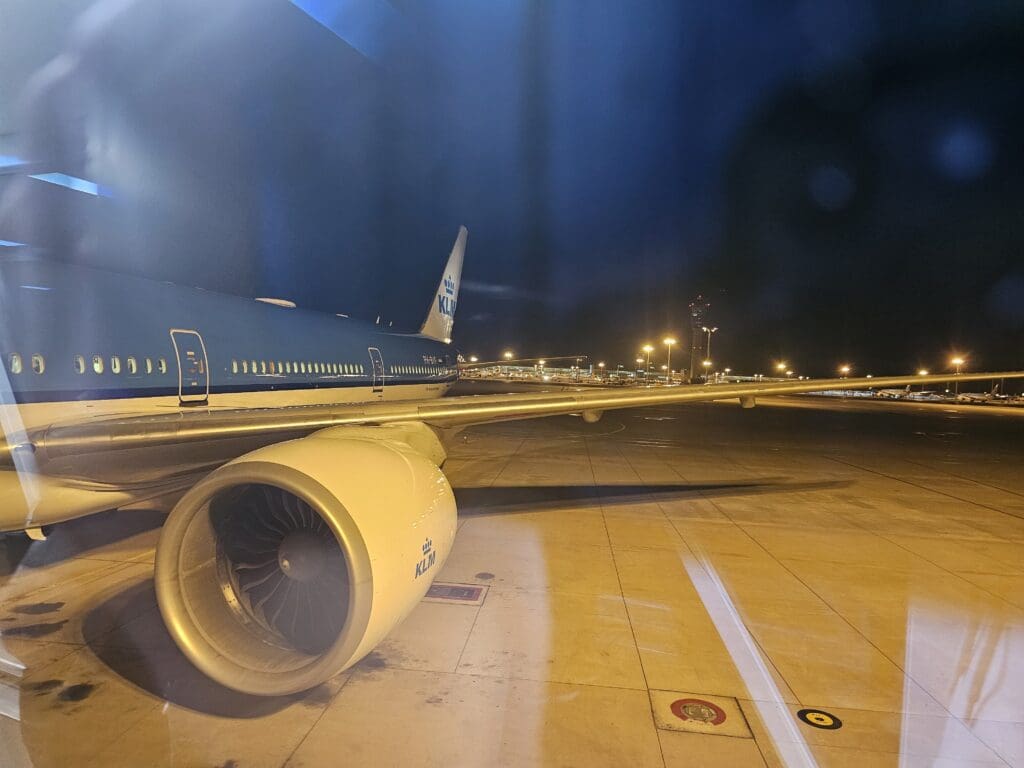 With no external cameras available to view through the inflight entertainment system and sitting in an aisle seat, it was hard to tell whether or not our aircraft was ready to be pushed back. Following a few minutes without any sort of activity in the cabin, twelve minutes behind schedule, the Boeing was pushed back away from the stand. As this was underway, KLM’s safety video took over the inflight entertainment screens. Dating back to 2015, at the time of my flight this was almost a decade old, and was the same video that had been played on my Boeing 747-400 Combi journey from Amsterdam to Seoul Incheon back in 2016! Despite its age, I found the video to be modern and up-to-date, continuing to serve its important purpose. Meanwhile, this is uniquely Dutch and rather memorable, having been made with over a thousand hand-painted Delft Blue tiles! This was broadcast in English only and accompanied by Korean subtitles, with no Dutch version of this played, or Dutch subtitles displayed. However, given the high levels of English proficiency in the Netherlands, and seemingly few Dutch passengers, this was perhaps no issue. As the aircraft neared the end of its pushback, the Boeing’s two mighty General Electric GE90-115B spooled up into life resulting in plenty of noise and vibration temporarily filling the cabin and ensuring that a decent portion of the safety video could barely be heard.