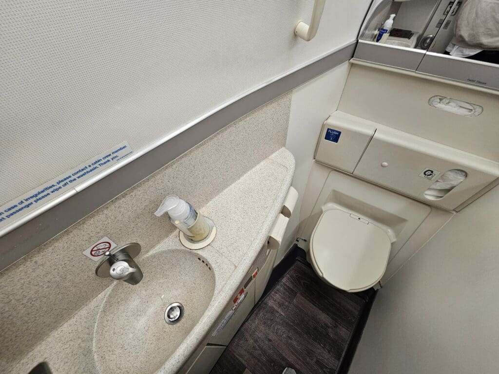 Getting to work on the meal, whilst the portion size was not particularly plentiful, it certainly hit the spot and gave me little reason to complain. Indeed, seeing as it was already after midnight in Korea, the chances are that most passengers will have eaten before boarding. Around thirty minutes later, the crew returned to the cabin to collect the empty trays before the lights were dimmed as we cruised high over Tianjin, China’s fourth largest city. After this, I decided to make a quick trip to one of the seven lavatories available for Economy and Premium Comfort passengers. This equates to a ratio of 49 passengers per lavatory, which isn’t too awful and is much better than the 63 passengers per lavatory figure on your standard LCC Boeing 737-800. Heading to one of the spacious lavatories at the very rear of the jet, upon opening this up I found this to be clean, tidy and stocked with the basics. Whilst this served its purpose and left me with relatively little to complain about, being a long overnight flight it would have been nice if toothbrush-toothpaste sets had been available in this.