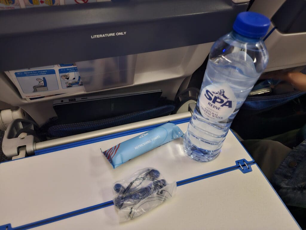 Seconds after taking off, the Boeing soared out over the complex of hotels, casinos and offices to the south of the airport and crossed the southern shoreline of Yeongjong Island. Climbing out over the waters of the Yellow Sea, we soon reached the northern coastline of Yeongheung Island before turning westwards and passing over the cluster of small yet inhabited islands that sit within Incheon’s Ongjin County. Heading out over the sea, the Boeing made a smooth climb which enabled the seatbelt signs to be extinguished as soon as we passed through 10,000 feet. At this point, the crew took to the galleys before emerging with service carts. A short time later, without a single word, I was handed a 500ml bottle of German mineral water, a packaged wet wipe and a packet of typical Economy-quality earbud-type headphones. It is worth noting that nothing in the way of an amenity kit was offered, which, whilst not expected given their increasing rarity, would have been a very nice touch on this long flight to Europe.