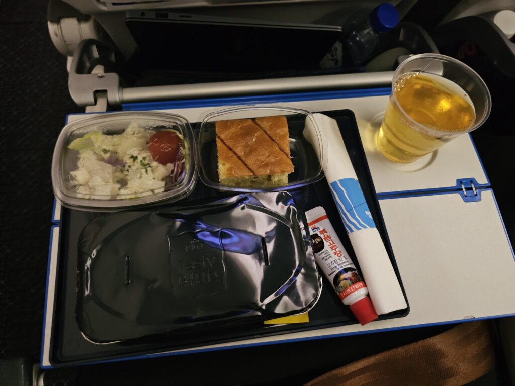 By the time the Boeing reached Hungary, the skies were filled with a picturesque orange glow and the cabin lights were switched back on in preparation for the second meal service of the flight. As we cut across a small portion of Eastern Hungary, the scent of warming food wafted through the cabin and as we passed into the skies of Slovakia, the crew rolled the service carts out into the aisles. KLM does not provide those in Economy with a paper menu, and since my last long-haul flight with the airline in 2016, the airline seems to have done away with advertising the meal choices for the flight on the inflight entertainment screens. Thus, there was no way of finding out what culinary treats would be in store until the service carts reached my row.