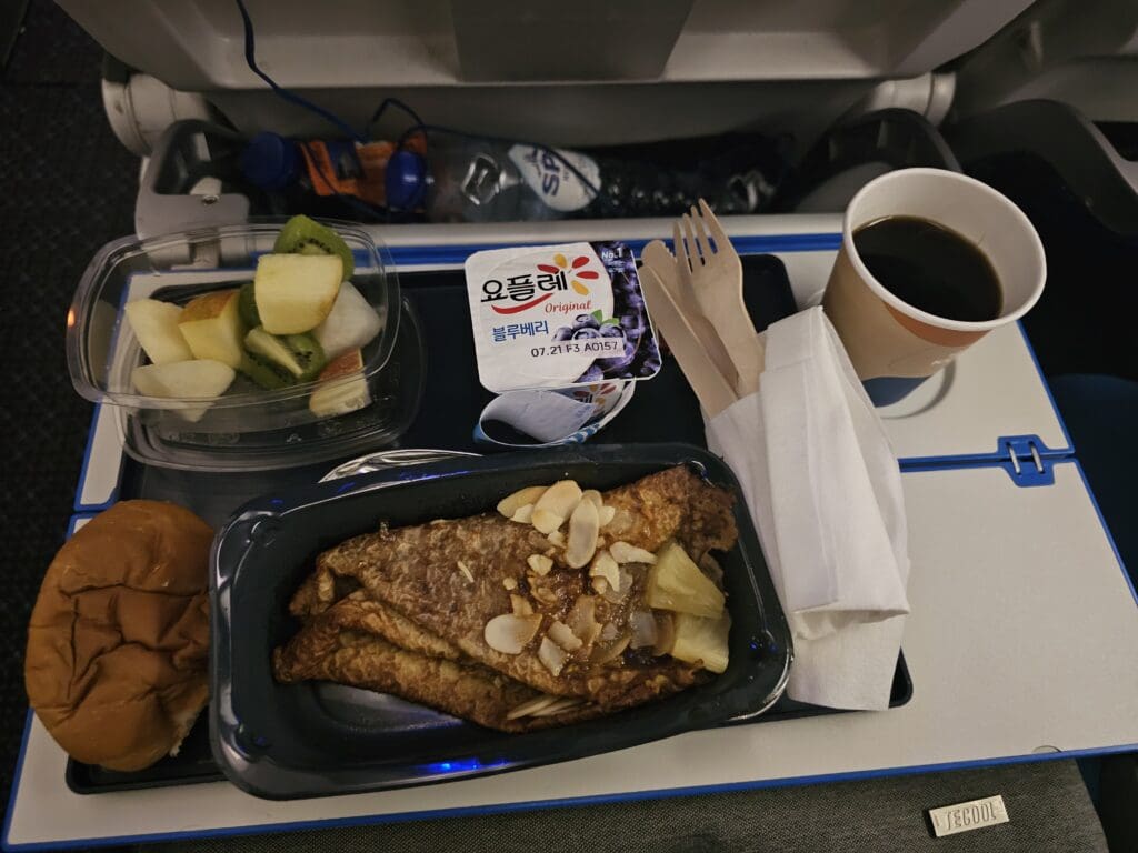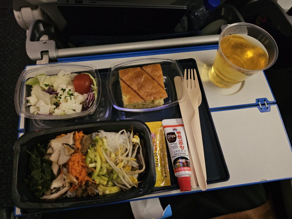 By this stage of the flight, a fair number of passengers had already drifted off to sleep, however, the scent of warming food filled the cabin and soon the crew emerged distributing passengers’ special meals. Around 45 minutes into the flight as the aircraft left the Shandong Peninsula behind, the evening meal service commenced. A few minutes later, with no options available, a friendly cabin crew member placed this meal on my tray table before offering me a drink. Opting to pair this with an apple juice, this was cautiously poured out before being handed over to me. Wasting no time, I opened up the main dish and found it to contain a compact beef bibimbap, accompanied by a small tube of gochujang and a sachet of sesame oil. This came with a side salad and a small cake for dessert. Those more used to flying Korean Air on the route may have been disappointed at the lack of metal cutlery, however, the next best thing was provided in the form of sustainable wooden cutlery.