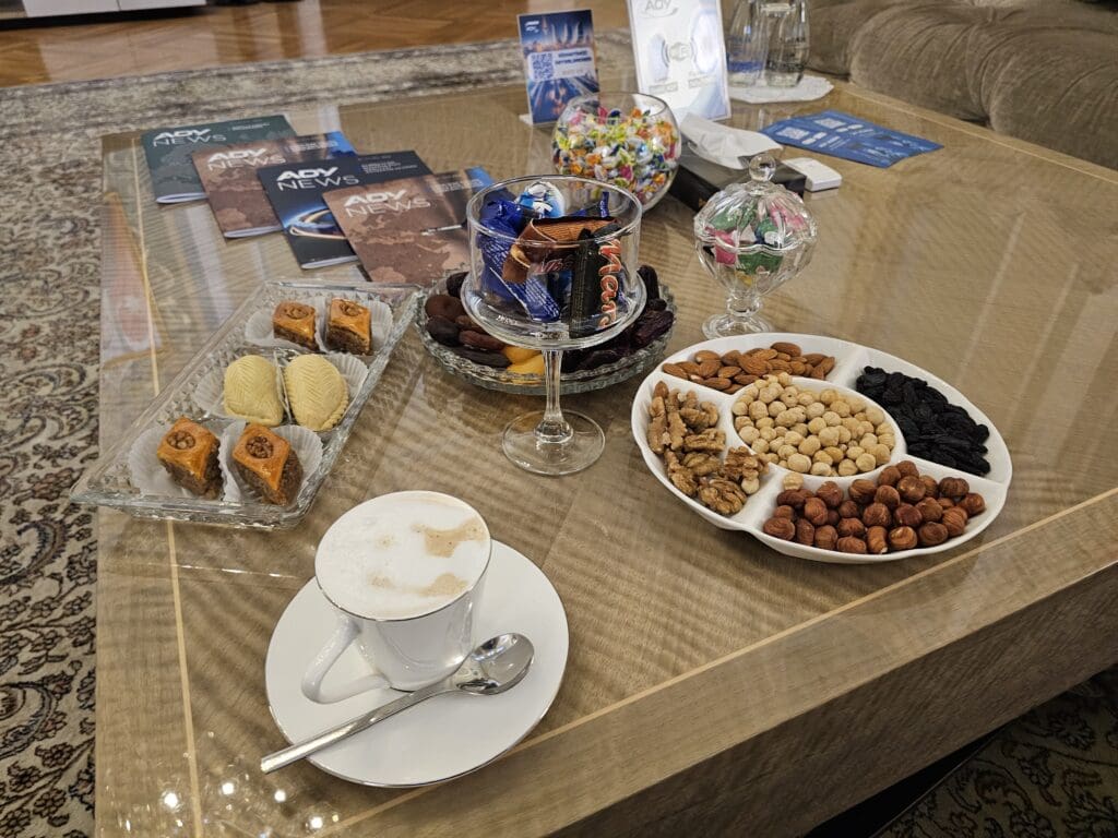 Upon taking a seat and sinking into the well-padded sofa, two plates of fruit and nuts were brought out and placed on the table, and I was offered a hot drink. Opting for a cappuccino, this was brought out alongside some traditional Azerbaijani sweets and a dish containing miniature chocolate bars. Being the only passenger in the VIP lounge, I have to say that this was a slightly surreal and eerie experience, and I have to say that it did feel as if I were being watched. Nevertheless, I tried to relax as I sipped my coffee, and around fifteen minutes later, a cheery-looking porter appeared, at which point my passport was returned and I was taken out to the platform where a modern Stadler train could be seen being readied for its trip to the mountains.