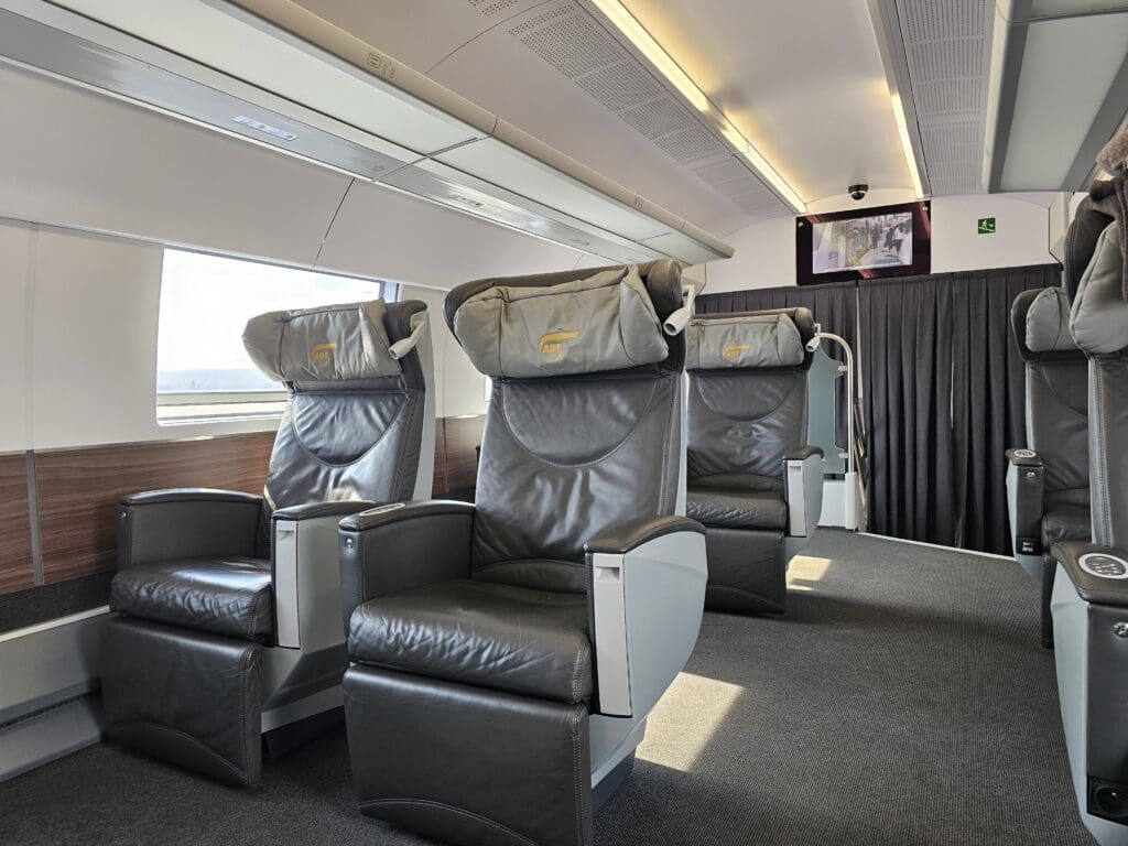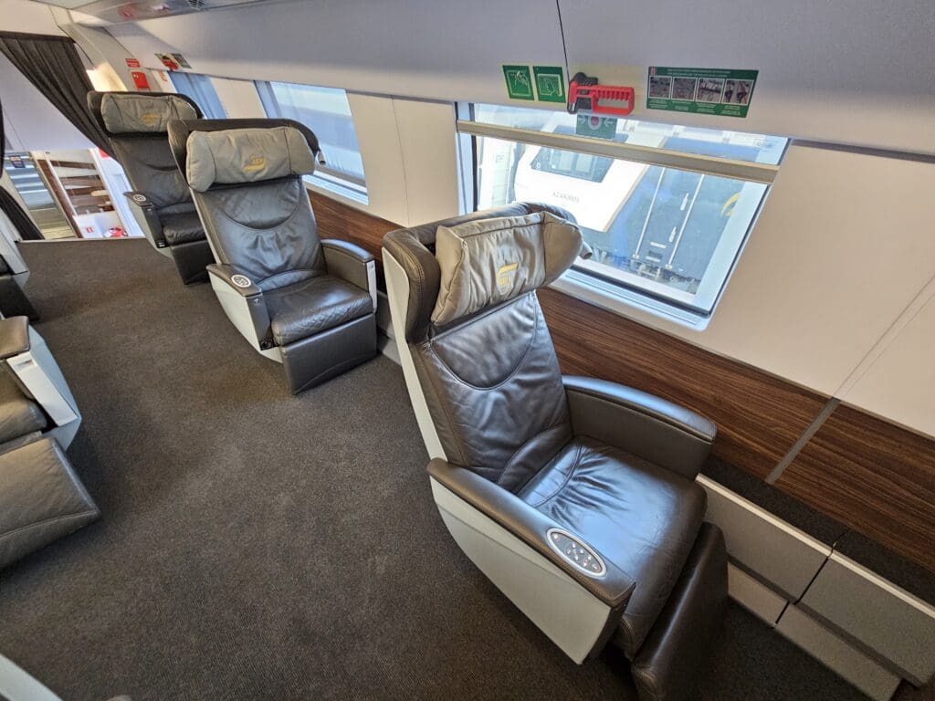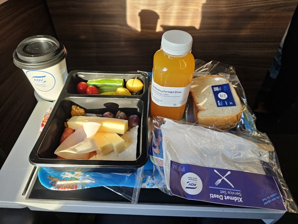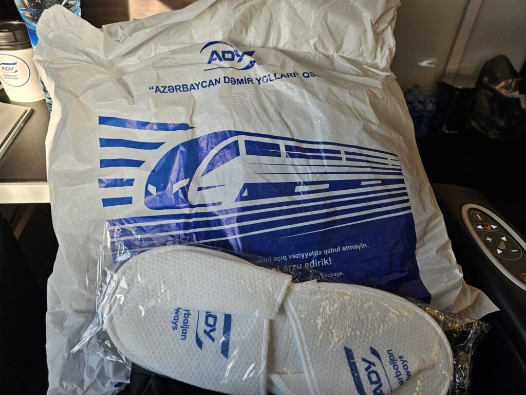Onboard, the train’s First Class section is located on the top deck at the very front of the four-carriage train (when leaving Baku), and so after walking the length of the train, the porter bid me farewell in Russian, and I was handed into the custody of one of the attendants who checked my ticket before escorting me upstairs to my seat. The train’s First Class section consists of nine seats arranged in a 2-1 configuration, each of which is a comfortable leather-covered recliner complete with a reading light. Upon taking my seat, I found it to be spacious, comfortable and clean, with no obvious signs of wear and tear, leaving me with absolutely zero complaints. Once seated, I was handed a package containing a blanket, slippers, and a neck pillow, along with a pouch that contained headphones and an eye mask. Upon settling in, I was handed a bottle of water and asked if I would like tea or coffee, opting for the latter, this was soon brought to me in an ADY-branded cup. That morning, there would be just one other passenger riding with me in First Class, who, judging by the fact they seemed to know all the onboard staff, I assume took the form of an ADY employee.