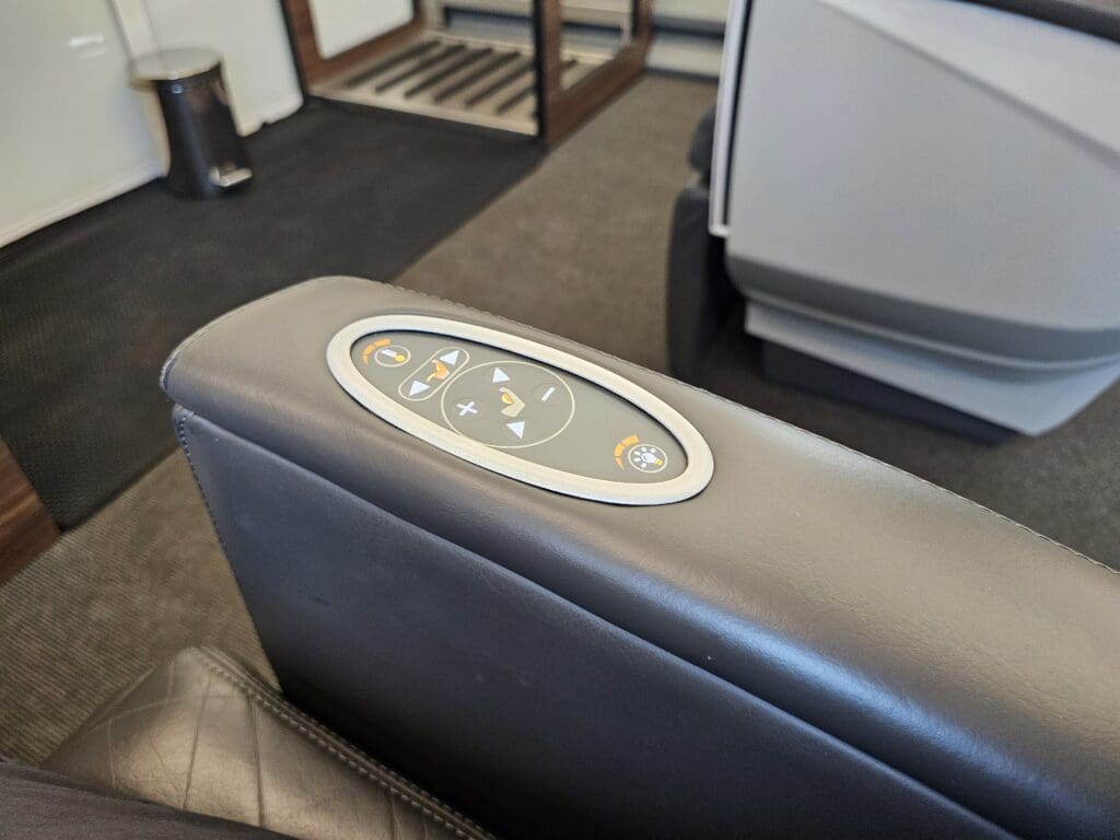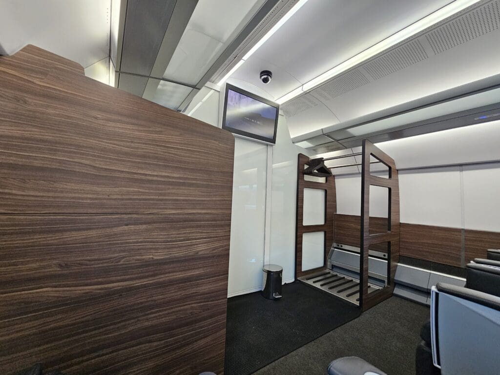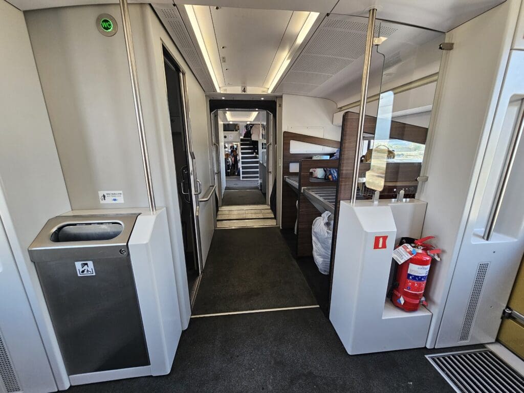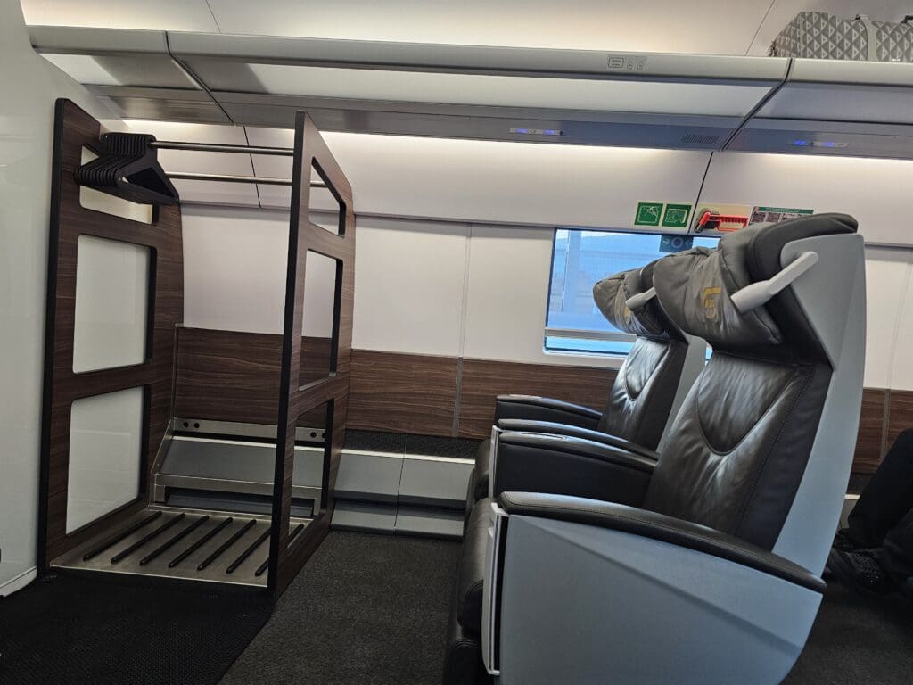Onboard, the train’s First Class section is located on the top deck at the very front of the four-carriage train (when leaving Baku), and so after walking the length of the train, the porter bid me farewell in Russian, and I was handed into the custody of one of the attendants who checked my ticket before escorting me upstairs to my seat. The train’s First Class section consists of nine seats arranged in a 2-1 configuration, each of which is a comfortable leather-covered recliner complete with a reading light. Upon taking my seat, I found it to be spacious, comfortable and clean, with no obvious signs of wear and tear, leaving me with absolutely zero complaints. Once seated, I was handed a package containing a blanket, slippers, and a neck pillow, along with a pouch that contained headphones and an eye mask. Upon settling in, I was handed a bottle of water and asked if I would like tea or coffee, opting for the latter, this was soon brought to me in an ADY-branded cup. That morning, there would be just one other passenger riding with me in First Class, who, judging by the fact they seemed to know all the onboard staff, I assume took the form of an ADY employee.