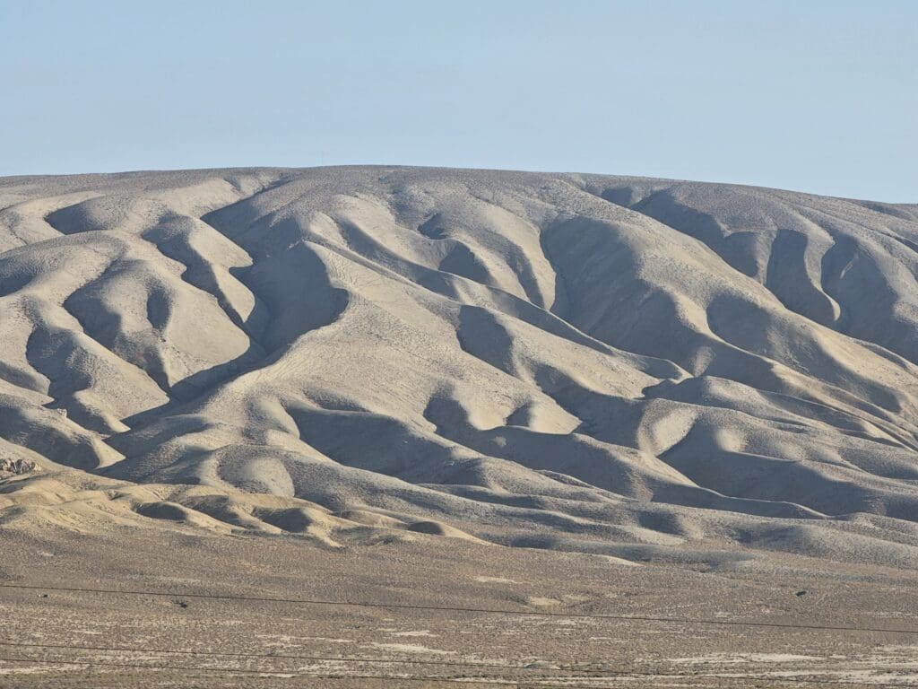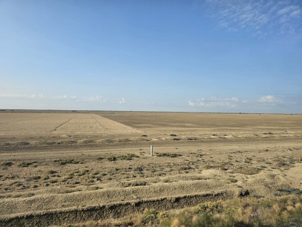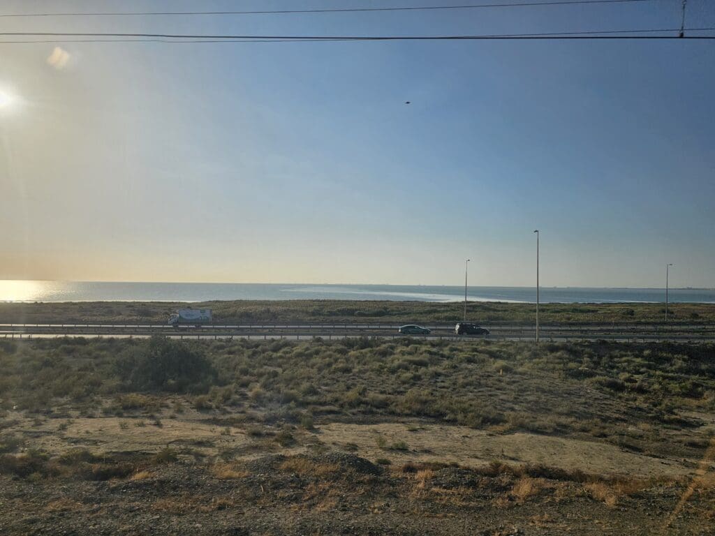 Following our stop at Bilajary, the train turned south and passed through a dusty and hilly landscape. There, plenty of nodding donkeys could be seen alongside the odd industrial estate and small town. Around forty minutes after leaving Baku Railway Station, the waters of the Caspian Sea came into view, and we skirted along the coastline for about twenty minutes before turning west and heading inland. Soon, the landscape around us temporarily rose up, resulting in some rather picturesque vistas before things flattened once again, with few hills seen until we neared our destination.