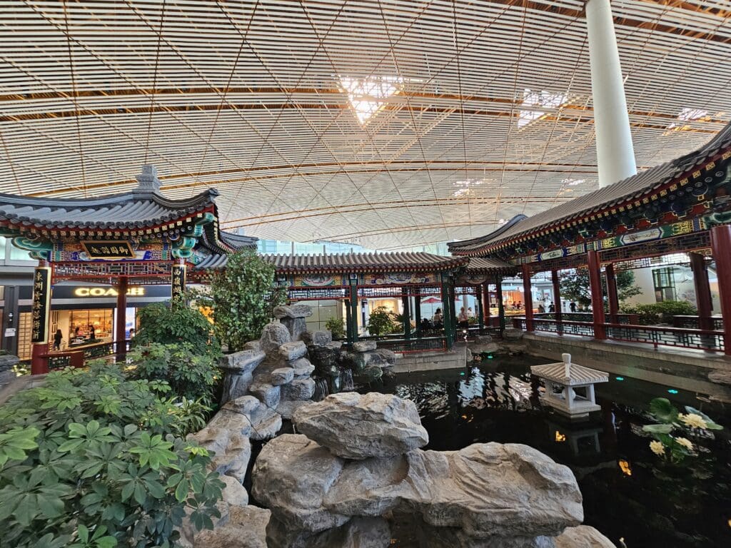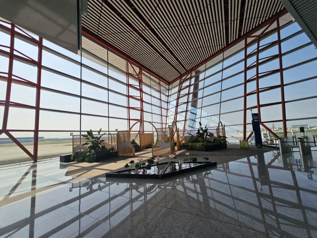 Beijing Capital Airport’s Terminal 3 was designed by Sir Norman Foster and opened in the run-up to the 2008 Beijing Olympics, making it around sixteen years old at the time of my trip. Designed to be a cutting-edge hub and play a major role in connecting China with the world, this is definitely one of the more architecturally impressive terminals that I have had the pleasure of passing through. Inside, this is bright, modern and spacious, whilst large floor-to-ceiling windows allow light to flood in, whilst high ceilings create a cavernous aura. Taking some inspiration from traditional Chinese architectural styles, plenty of reds and golds can be seen throughout the terminal, whilst the roof was designed to resemble the scales of a dragon. Meanwhile, a traditional pavilion and pond can be found in the heart of the terminal, although, admittedly, this did not come close to Beijing Daxing’s outdoor garden!