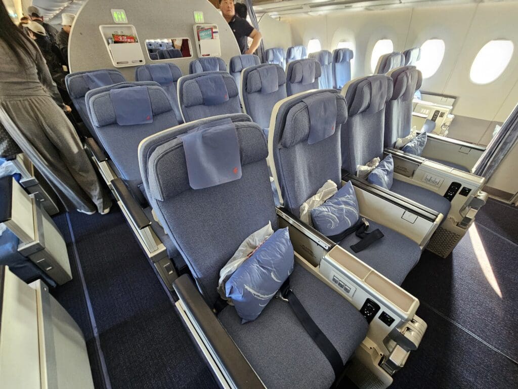 Leaving me with a positive first impression, as soon as I stepped into the galley that separates the Business and Premium Economy cabins, I received a warm and friendly greeting in English. Once one of the flight attendants had checked my boarding pass, I was directed down the second aisle and soon received another warm greeting as I entered the Airbus’ small Premium Economy cabin. This consisted of just three rows of Recaro PL3530 seats in a 2-4-2 configuration. Each of these was covered in a blue fabric cover and topped by a large headrest partially covered by an antimacassar. Whilst I am no premium economy expert, these seats seemed to be very standard in their design, with little to distinguish them from those of many other airlines.