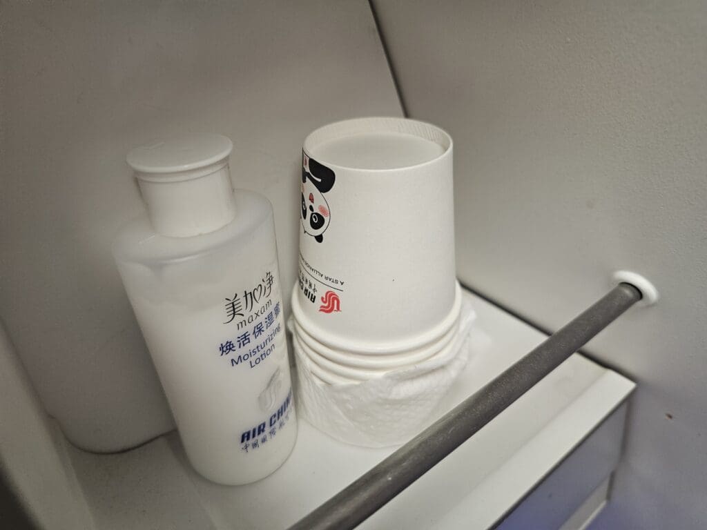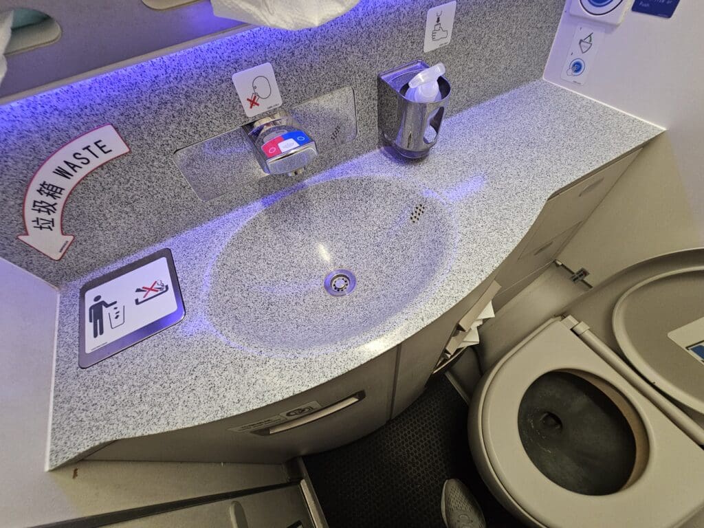 As we journeyed westwards, the crew seemed to pass through the cabin every hour or so, distributing water to those who were awake. Other than this, no other drinks or snacks were offered between meal services whilst the galley remained out-of-bounds for passengers during the flight. Around halfway into the flight, I decided to pay a trip to one of the six lavatories available for use by those in Economy. Four of these sit between the two Economy cabins, whilst two sit at the rear of the aircraft. Heading into one of the two at the rear, I found this to be clean and stocked with the basics alongside the welcome addition of moisturising cream. However, this was accompanied by a rather unpleasant and overbearing stench that saw me do everything possible to avoid a prolonged stay there!