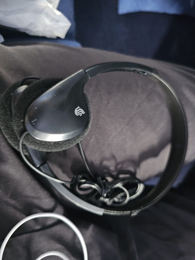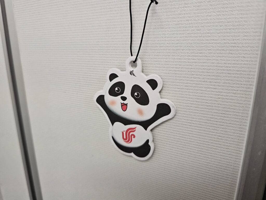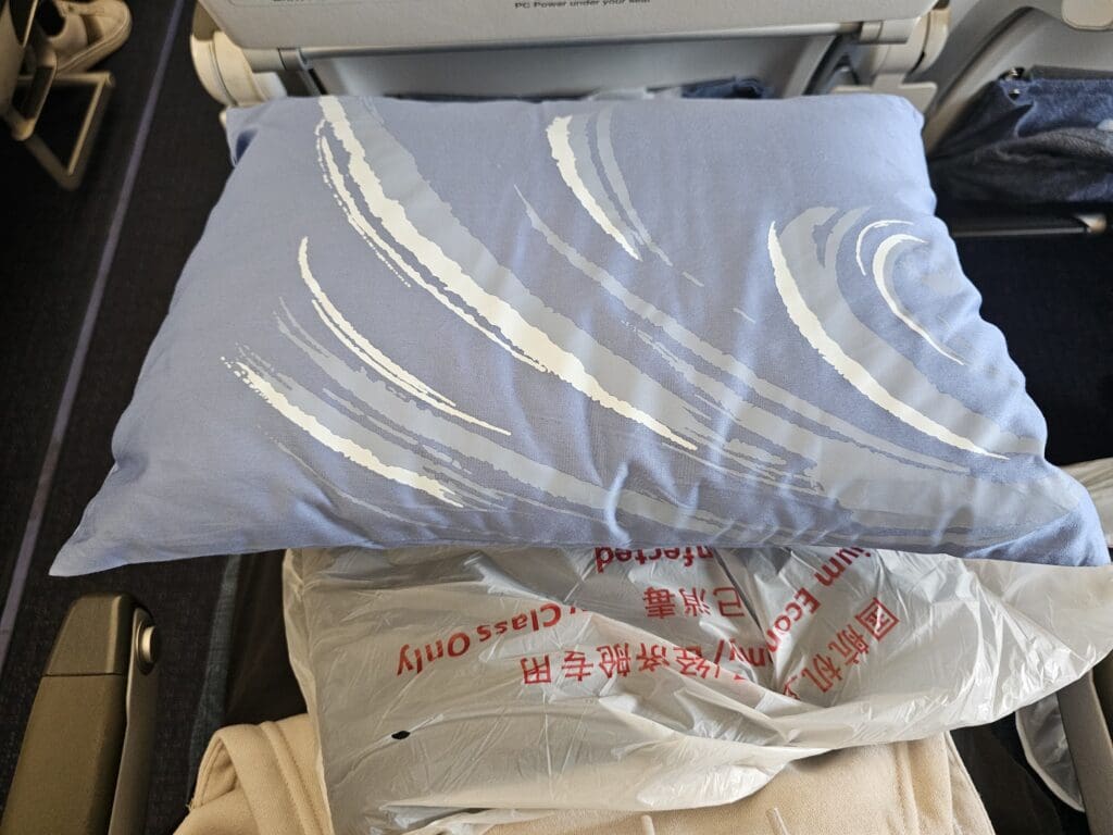 Given the small size of the Premium Economy cabin, I steamed through this quickly and soon reached the forward Economy cabin where I was delighted to receive another greeting. Air China’s Airbus A350s feature the fairly common Recaro CL3710 seat in Economy, with these arranged in a standard 3-3-3 configuration. Each seat is upholstered with Air China’s standard dark blue fabric cover which features a swirling pattern and is topped by a sturdy headrest that is partially covered by a disposable fabric antimacassar. As one would expect to find on a modern widebody airliner that operates long slogs across the world, each seat came with a high-definition inflight entertainment screen, with these powered by the Panasonic eX3 system. In addition to these personal screens, each seat features a coat hook, a bifold tray table, a seatback pocket, a literature compartment, a USB-A port and a universal power outlet. Given the length of the flight, standard Economy quality pillows and blankets had been placed on each seat before boarding, whilst low-quality headphones could be found in the seatback pockets. Finally, the literature compartment contained a safety card, sickbag and the latest copy of Air China’s Wings of China inflight magazine.