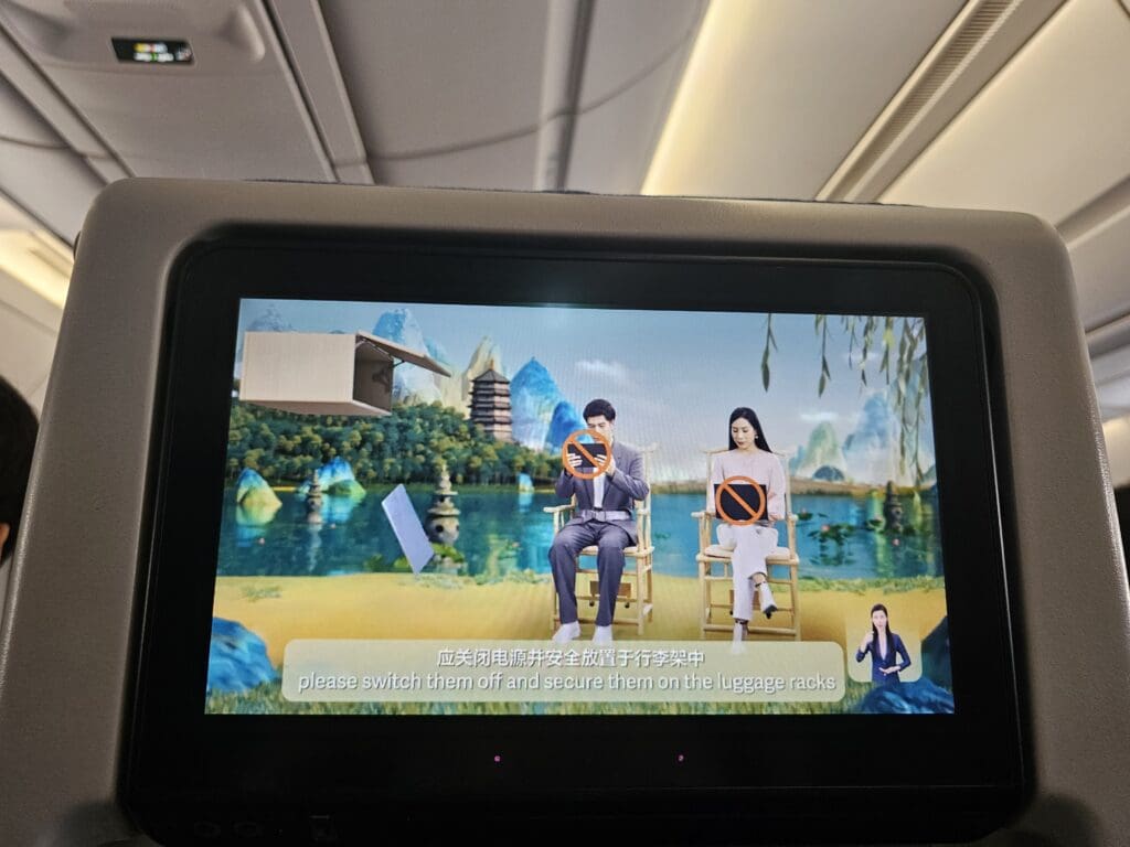 As I had suspected, that evening, the Airbus was to be far from full and the final passenger made it onto the aircraft with ten minutes to go until our scheduled departure time. Glancing around, perhaps unsurprisingly, most of those around me seemed to take the form of Chinese workers, business people and tour groups heading to the United Arab Emirates. Once all passengers had taken their seats, the music that had accompanied the boarding process came to an end, and without any sort of welcome announcement, all of a sudden, Air China’s safety was broadcast over the inflight entertainment screens. Released in 2022, this takes the form of a high-budget half-animated safety video that details the safety instructions in Mandarin and English. Even though we were bound for Dubai, this video was not accompanied by any Arabic subtitles, nor were any pre-recorded Arabic announcements played for the duration of my flight.