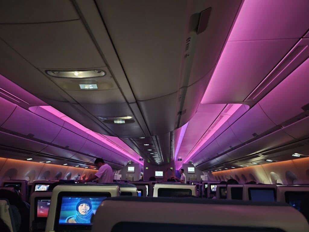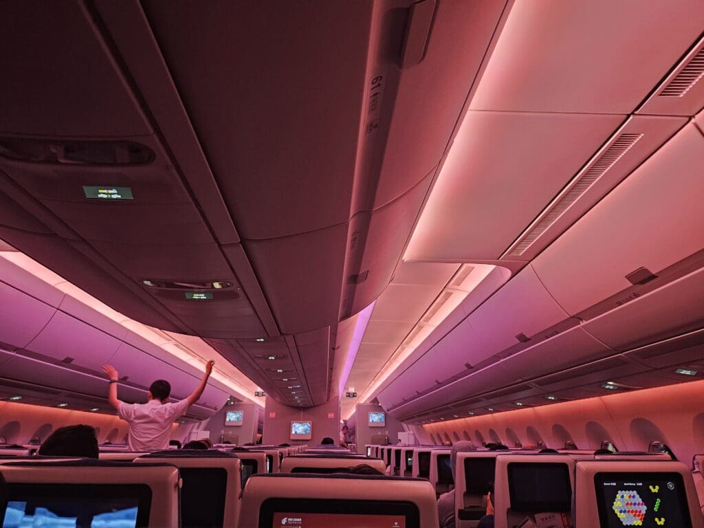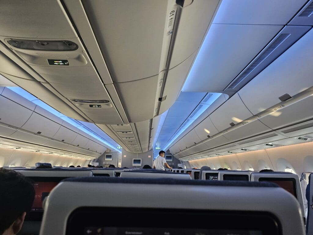 As the safety video neared its end and with two minutes to go until our scheduled departure time, at 1728, the Airbus jolted backwards and was pushed back away from its parking position. As we headed rearwards, a series of hums and whirs could be heard as the Airbus’ two massive Rolls-Royce Trent XWB engines powered into life, ready to haul us all across East and Central Asia before ending up in the Middle East. At this time, the army of flight attendants passed through the cabin, undertaking their pre-departure checks, taking the time to ensure that absolutely everything was safe and secure in preparation for our departure. A few minutes later, the Airbus commenced its taxi to the end of Runway 19, at which point the Purser performed a quick welcome announcement in Mandarin and English. Rather than primarily welcoming or thanking passengers, this announcement (perhaps sensibly) seemed to be more concerned with detailing the prohibited items, actions and behaviours onboard and was then followed by a very similar pre-recorded announcement in Mandarin and Australian accented English which reiterated these instructions and warned passengers of the potential criminal consequences of not abiding by the cabin regulations.
