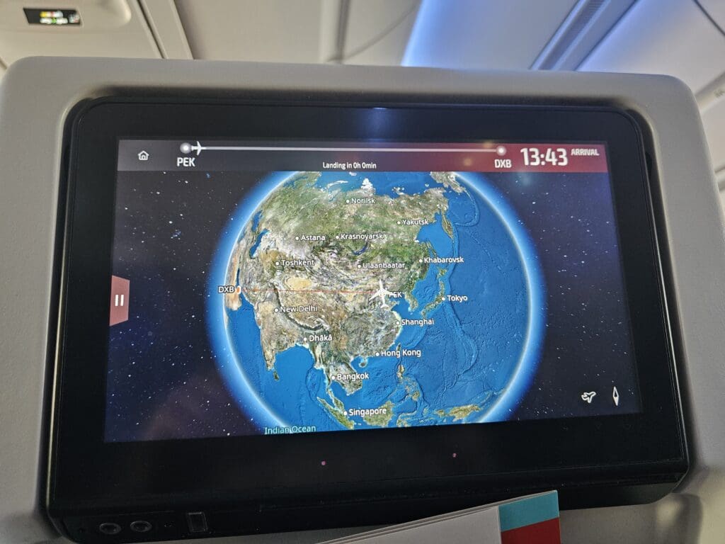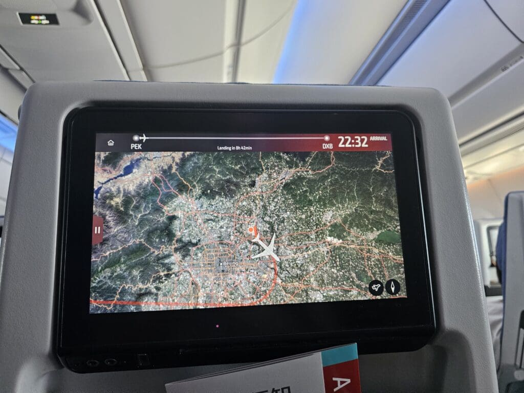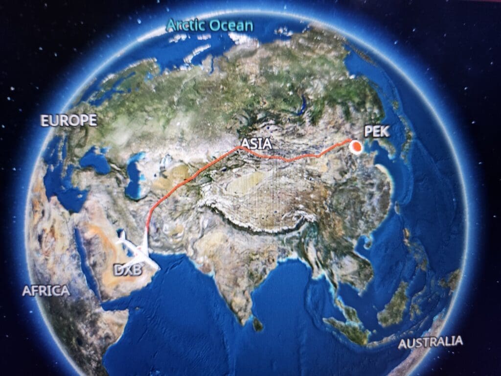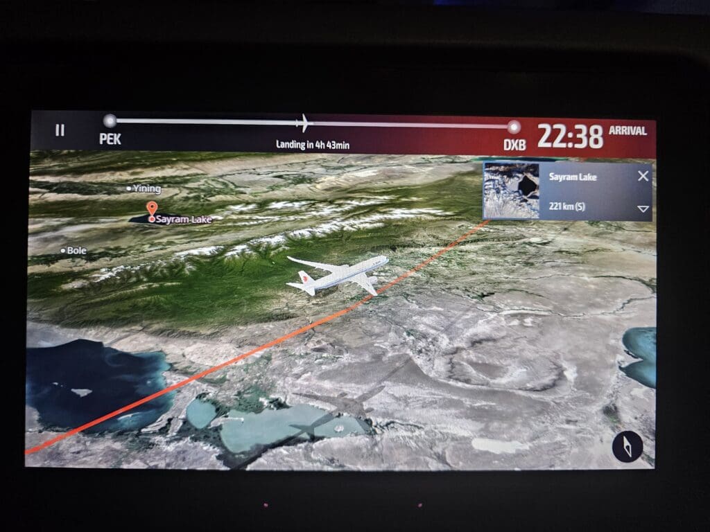 After a total of 34 minutes in the skies of Northeast China, the Airbus levelled off at its initial cruising altitude of 36,000 feet, at which point the crew were released from their seats and passengers were free to move about the cabin. At this stage, the Purser undertook a more comprehensive welcome than had been offered on the ground, which offeredthe usual cautionary instructions regarding keeping seatbelts fastened whilst seated. As the cabin crew prepared for the first round of service, the Captain’s voice filled the cabin as they performed their first and only announcement of the flight. This was undertaken in Mandarin and English, and consisted of a word of thanks, before detailing our altitude, cruising speed, the expected 8H40 flight time to Dubai and our estimated time of arrival.