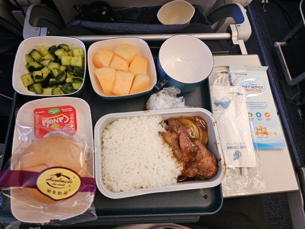Once the Captain’s announcement had come to an end, the service carts were rolled out and a round of drinks was made. Being one of the first passengers to be served, I opted for an orange juice which was poured into an Air China paper cup and passed to me. Despite not being undertaken in an overly unfriendly manner, I found this first round of service to be a little brash and rushed, with the crew appearing to prioritise speed and efficiency over friendly interaction with passengers. Around twenty minutes later, the Purser undertook an announcement that advised passengers of the soon-to-commence evening meal service. During this, the crew member noted that there would be two options in Economy – chicken or fish, and apologised in advance if passengers’ first choice of meal was unavailable. Once again, I ended up being one of the first passengers to be served and within moments of the announcement ending, the flight attendant reached my row, and glanced at me without a single word. Seeing this as my cue to express my choice, I asked for the chicken and soon a tray was handed over to me. This contained the main dish, white rice with chicken in a slightly spicy sauce, a side dish consisting of pickled cucumbers, a packaged bread roll with butter, and some melon chunks for dessert. Meanwhile, a packaged antibacterial wet wipe and a sachet containing a serviette and a plastic spork and knife accompanied the food items.