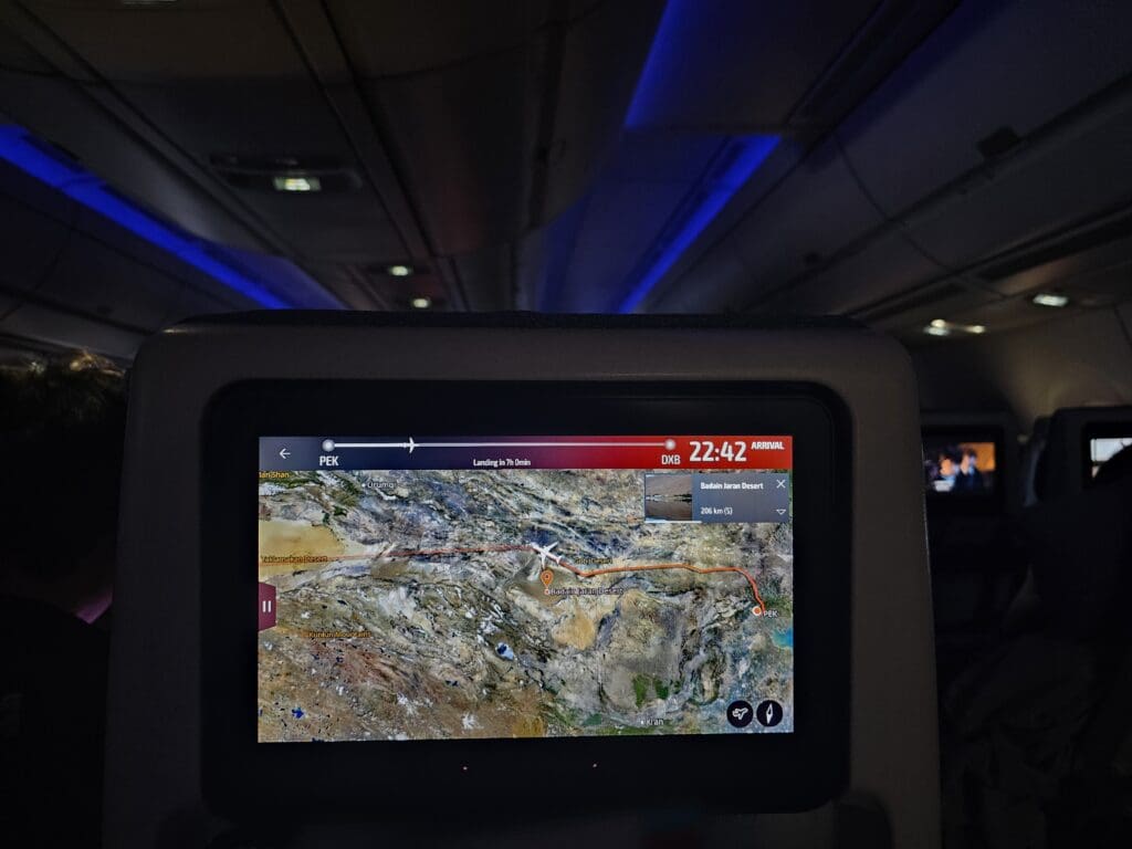 By the time the Airbus crossed into Turkmenistan’s skies and passed the city of Turkmenabat, the moving map showed that we had a little under three hours to go until our arrival in Dubai. At this time, the scent of warming food filled the cabin once more and at 0000 Beijing time or 2000 UAE time, the cabin lights transformed to their sunrise orange glow, waking up those around me. Twenty minutes later, the Purser performed an announcement advising passengers in Economy that breakfast was soon to be served, with a Chinese option (rice porridge) and a Western option (omelette with chicken sausage) offered. At this stage, my first thought was that this was an odd choice of meal given the fact that, unless you work irregular hours, we were a long way from breakfast time in both Beijing and Dubai! Nevertheless, I was still thankful that a second meal was served, given the fact that many airlines would have relegated this to a snack or light meal considering the length of the flight.
