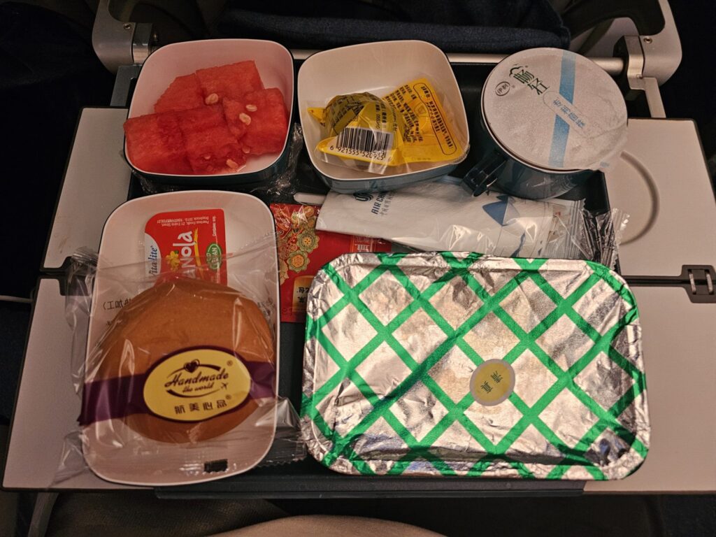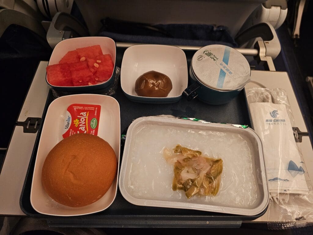 Opening up the main dish, this consisted of plain rice porridge that was accompanied by a tea egg and a sachet of pickled vegetables. Meanwhile, this was served with plain yoghurt, some watermelon cubes and a packaged bread roll with butter. Once again, whilst not the pinnacle of inflight cuisine, this was edible and left me with relatively little to complain about. Furthermore, the trays were collected in good time and not left blocking passengers in for an unreasonable amount of time. I should also mention that given the flight time, many airlines would have perhaps relegated this meal service to a snack rather than a full meal.