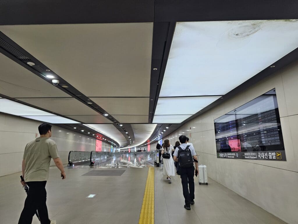 Once on the south side of the river, the train headed back underground for one more stop before pulling into Gimpo Airport Station around eighteen minutes after leaving Gongdeok. As is usually the case at that time of the morning, I made my way off the train and was joined by crowds of Jeju-bound holidaymakers, airport staff, cabin crew and pilots, and commenced the long ascent to the station’s atrium. Once there, I tapped my T Money on the barriers and had the very reasonable 1,600 won (£0.92) fare deducted before I turned left and commenced my journey down the moving walkways of the long well-polished corridor that connects the station to the domestic terminal, arriving there around five minutes after disembarking the train.