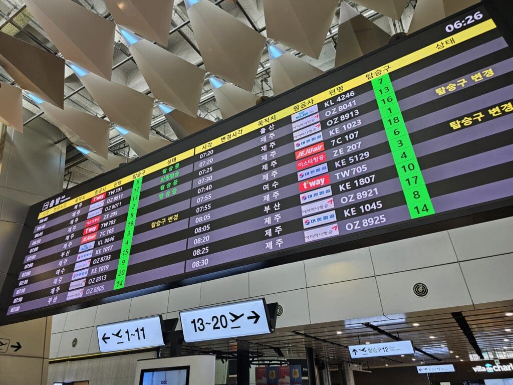 Throughout the terminal, floor-to-ceiling windows provide clear vistas of many of the terminal’s stands as well as the airport’s two runways. As is always the case, plenty of aircraft could be seen there from almost every single Korean airline, with jets from Air Busan, Air Seoul, Asiana Airlines, Eastar Jet, Jeju Air, Jin Air, Korean Air and T’way Air, spotted being readied for a new day of flying. Of course, being a domestic terminal in Korea, most flights were bound for Jeju, with Busan in second place. Had I not wanted to go to either of the two, I also spotted services bound for Gwangju, Jinju, Pohang, Ulsan and Yeosu. Admittedly, with all of these cities sitting a two to three-hour train ride from Central Seoul, I’ve never been quite too sure as to why these flights are popular. Perhaps many of those who take these are travelling to and from Korea’s third largest city, Incheon, which isn’t connected to Korea’s high-speed rail network.