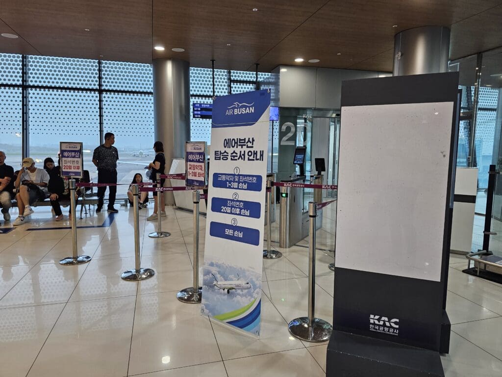 Following a wander around and a toilet stop, by this time, having had nothing more than a quick sip of water after waiting up, I was parched. Whilst I had pondered stopping by at one of the terminal’s cafés, I decided to save my first coffee of the day for Jeju and instead headed to the convenience store for a bottle of barley tea. With this in hand, I checked the departure boards which revealed that my flight would depart from Gate 20 at the far western end of the terminal and one of the furthest gates from the central hub. Nevertheless, given the comparatively small size of the domestic terminal compared to many major airport terminals, getting to the end of the terminal was not a particularly long or arduous trek and I could almost make the entire journey via moving walkways. Slowly sauntering along, I eventually arrived at the end of the pier where I was greeted by fairly busy scenes, however with a Jeju Air flight departing from the neighbouring gate, it was tricky to decipher just how busy the Air Busan service to Jeju would be. Nevertheless, seeing as the flight had been downgraded from an Airbus A321 to the notably smaller Airbus A320, I suspected that this may be rather full.