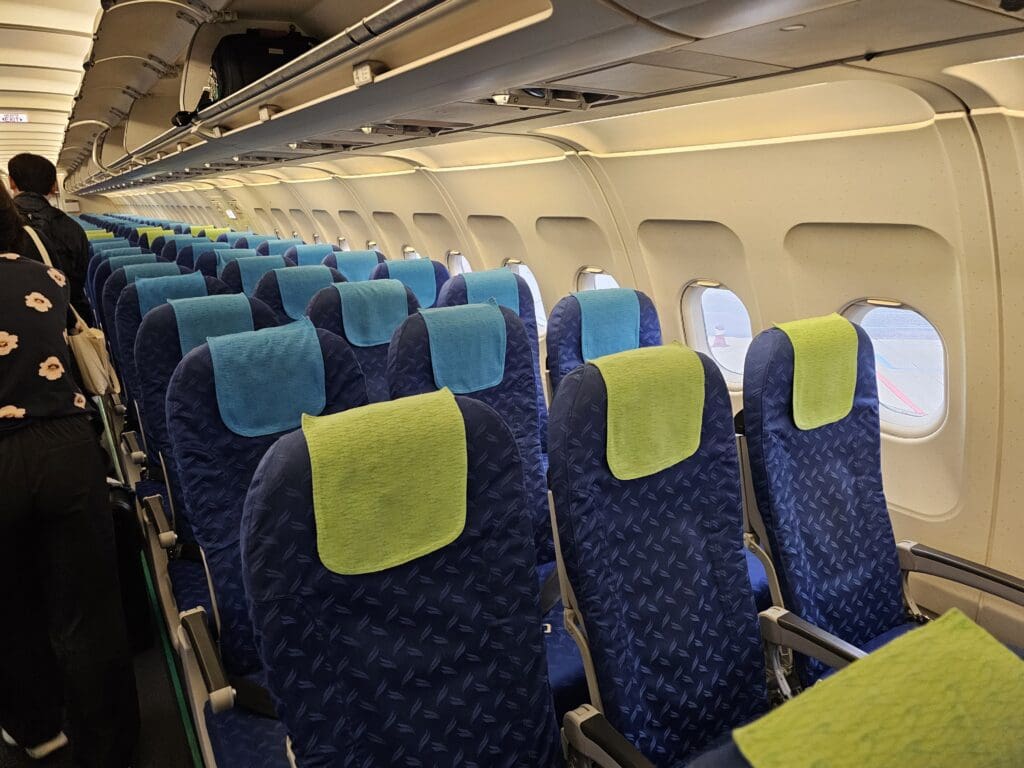 As passengers filtered onto the aircraft, calming saxophone music rang out and with passengers having made it to the gate on time, the final passenger made it onto the jet around six minutes ahead of our scheduled departure time. That morning, the flight seemed to be full, with most of those around me taking the form of Jeju-bound holidaymakers hailing from Korea. Indicating that we would be in for a punctual departure, once the final passenger was safely onboard, the cabin door was closed and the jetbridge could be seen being backed away from the aircraft, whilst all remaining ground service equipment was removed from around the jet. At this time, the Purser conducted their welcome announcement in Korean and English. During this, they welcomed passengers onboard, thanked all for flying with Air Busan, mentioned our 55-minute flight time, and ended this with a warning to passengers about seatbelts and adhering to Korea’s Aviation Security Law. Once this had been completed, the crew took to the aisles and a standard safety demonstration was performed. This consisted of several members of the cabin crew undertaking the safety demonstration whilst the Purser went through the instructions in Korean and English.