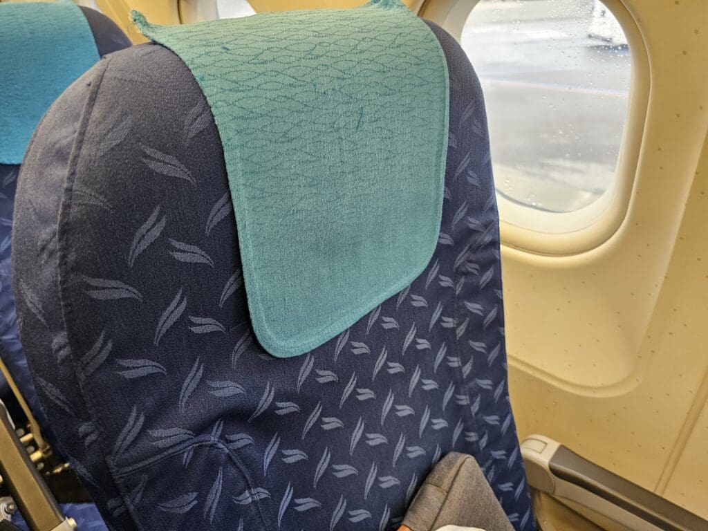 Upon entering the forward galley, I received a polite yet slightly subdued greeting from the two flight attendants standing there donned in Air Busan’s distinctive blue uniform. Once one crew member had checked my boarding pass, I passed through the windbreak and entered the Airbus’ cabin. During my previous trips with Air Busan, I found that those aircraft that had previously operated for Asiana Airlines had received little by means of a reconfiguration other than the removal of Business class seats and their replacement with Economy ones. Whether it be the Airbus A320, Airbus A321 or Boeing 737-400, when flying with Air Busan I enjoyed the incredibly spacious luxury that was totally at odds with what most imagine when they think of a low-cost carrier! Sadly, all good things must come to an end, and since my last flight with Air Busan in October 2018, the airline has reconfigured its older aircraft with a more low-cost configuration. Thus, this particular Airbus A320, came with 180 seats, which is a very low-cost carrier standard configuration for the type. Onboard, each seat took the form of the relatively modern Recaro BL3530, each of which was covered in Air Busan’s standard royal blue fabric cover that featured a repeating pattern of seagull-inspired wings (the seagull is the official bird of the city of Busan). Meanwhile, each seat was topped with a fabric antimacassar that was either light blue in the case of ordinary seats, or lime green for those seats that could be reserved for an additional fee. These seats were fairly spartan and came with a literature compartment, seatback pocket, tray table and coathook. Sadly, unlike Air Busan’s more recent deliveries, these seats lacked any form of at-seat power, however, given the short flights that this particular aircraft operates, these were not particularly missed.