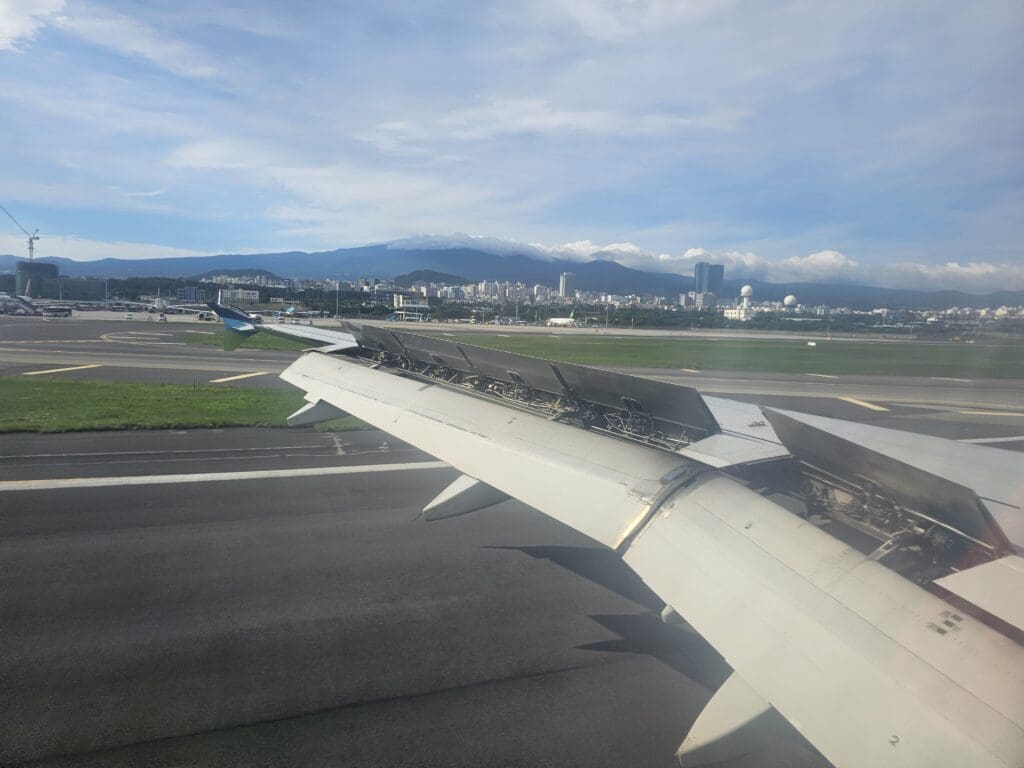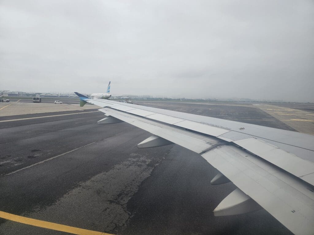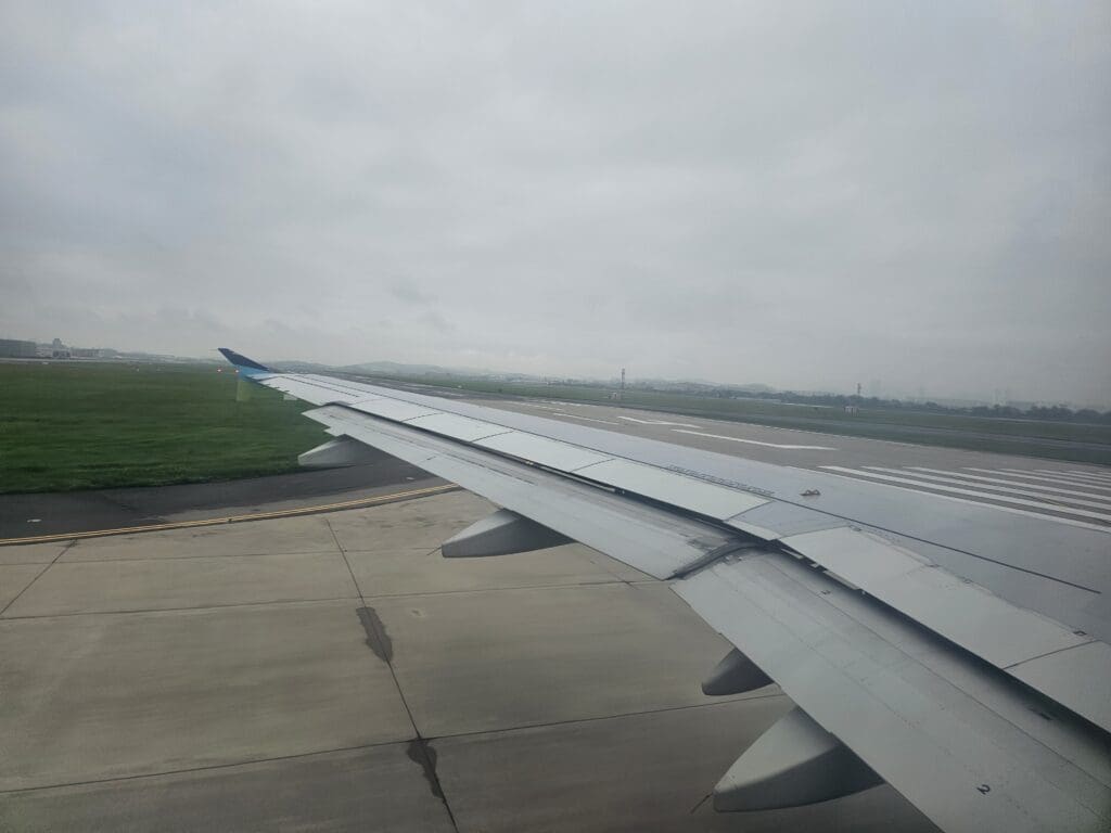 Despite the early finish to boarding, it seemed that air traffic control had other plans and in the end, it wasn’t until 0718, eight minutes after our scheduled departure time that pushback commenced. As this was underway, the Airbus’ two IAE V2527-A5 engines whirred into life ready to propel us all down to Jeju. Following the usual short pause whilst the tug was disconnected, the flaps were partially extended before the Airbus commenced its journey to the end of Gimpo Airport’s Runway 14L. Sitting on the left-hand side of the aircraft, little could be seen during this journey other than the sight of aircraft rocketing off ahead of us and the hangars in the distance as we trundled past the international terminal and fields that surround the airport. As we trundled along, a sleek Air Busan Airbus A321neo followed a short distance behind us, with this bound for Busan.