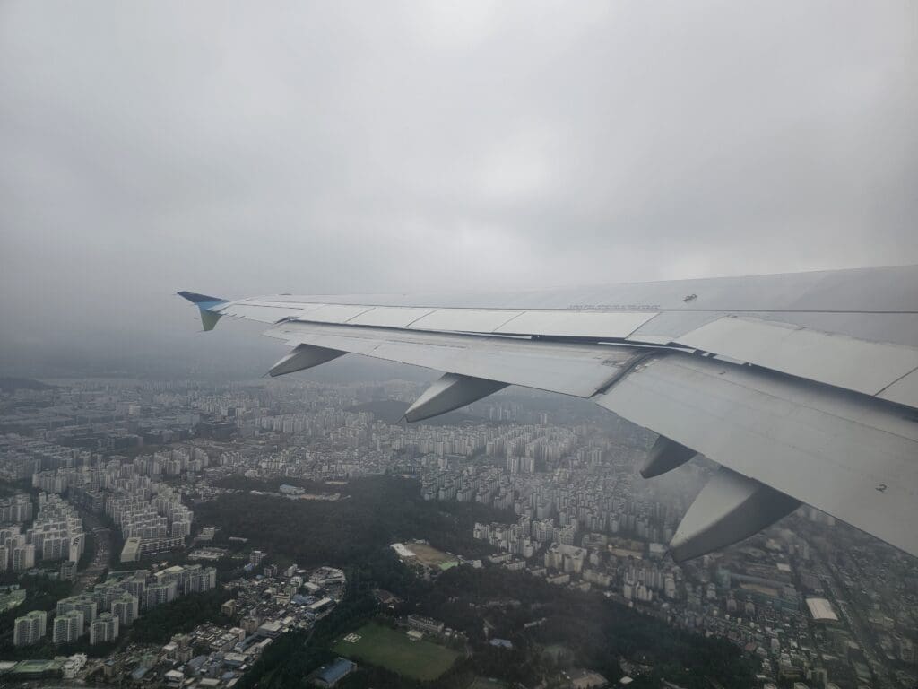 From the airport, the Airbus climbed out over the neighbourhoods of endless concrete apartment blocks to the south of the Han River. However, the vistas of Seoul did not last for too long and we soon made our way into the clouds, bumping through these before we turned onto a southerly heading that would see us slice through Gyeonggi Province. From Gimpo Airport, the Airbus passed directly over the city of Suwon, famous for its Joseon-era fortress and for being the home of Samsung. After which, the aircraft turned to fly towards Korea’s western coastline and soon passed over Pyeongtaek, which is well known for its large American military base before we crossed into the skies of South Chungcheong Province near the cities of Asan and Cheonan.